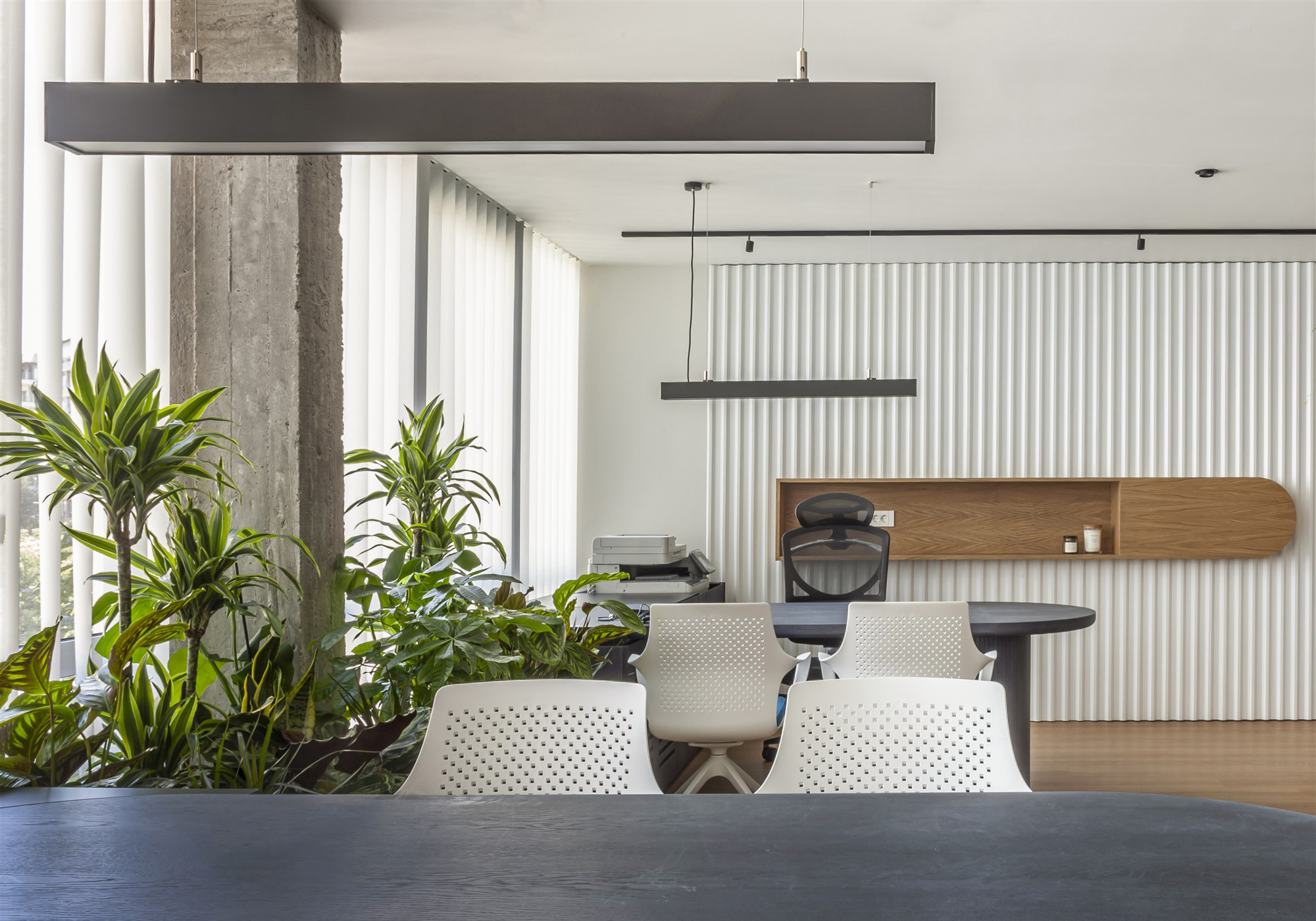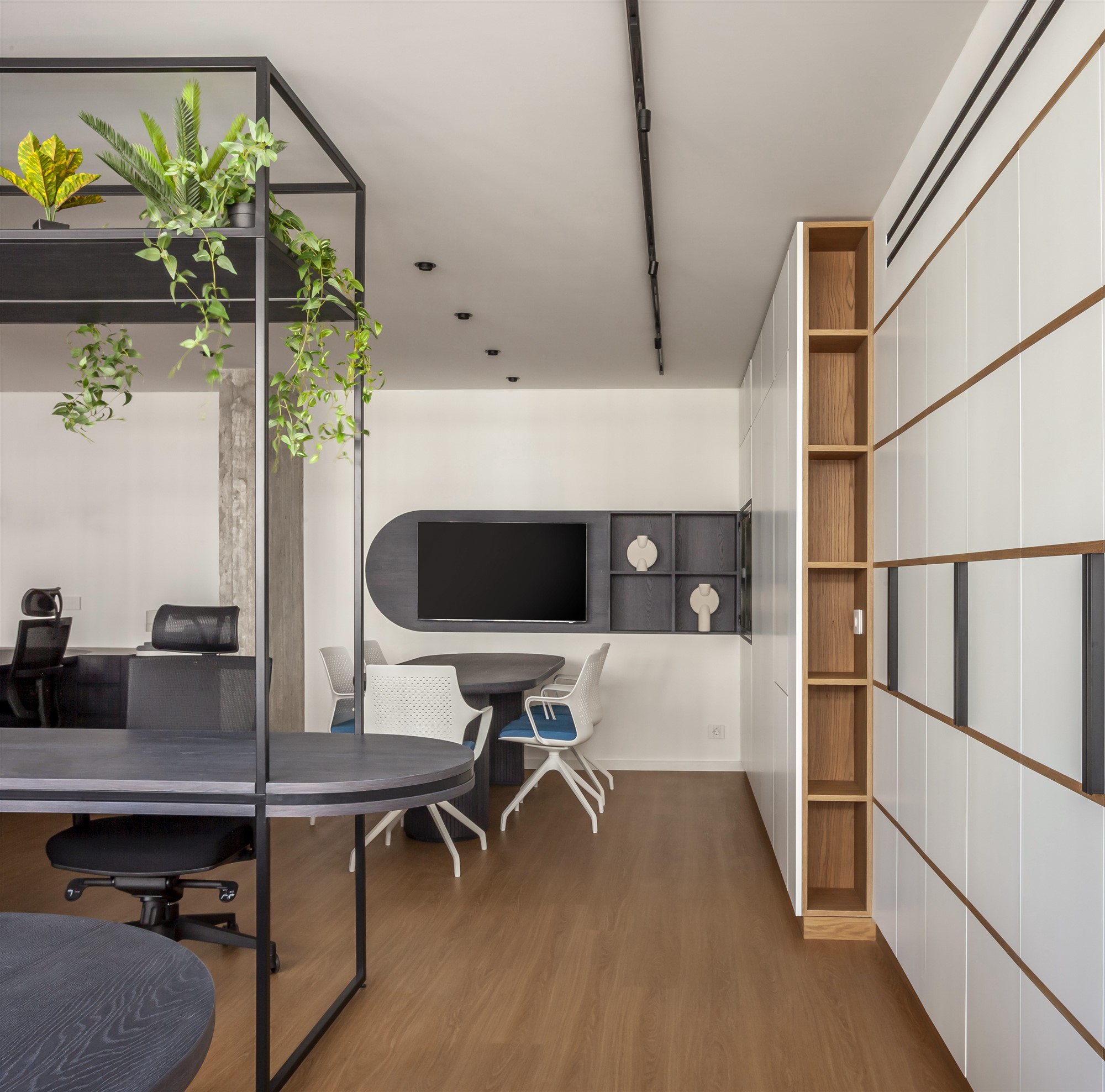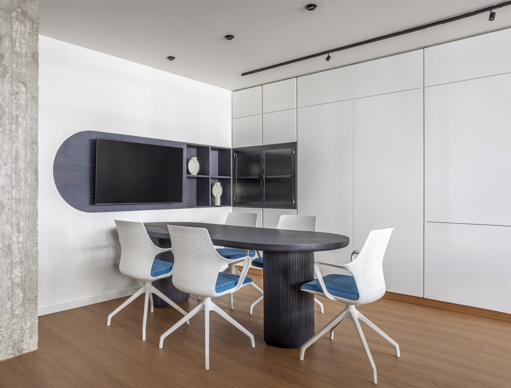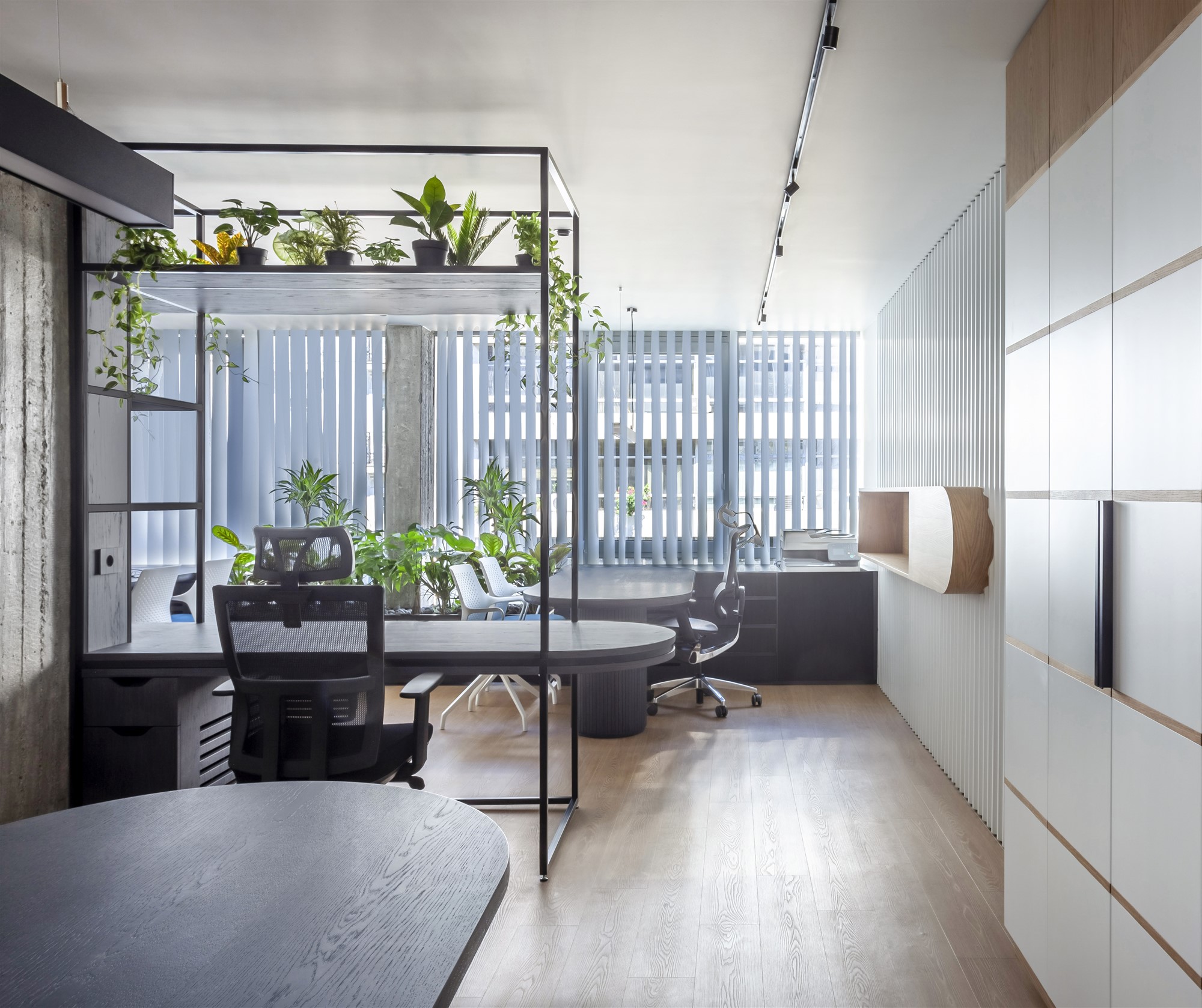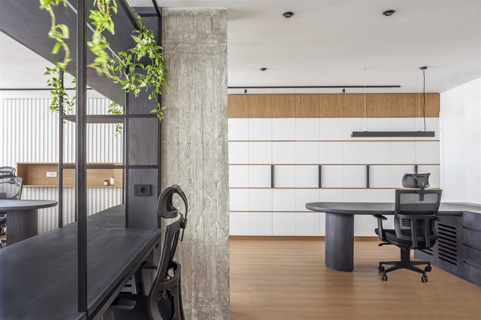 The result is an office where function and composition converge—a compact yet expansive environment that balances efficiency, light, and visual calm. Here, every surface and angle is designed to foster clarity, interaction, and a subtle tension between solidity and openness, embodying a contemporary approach to urban workspace design.