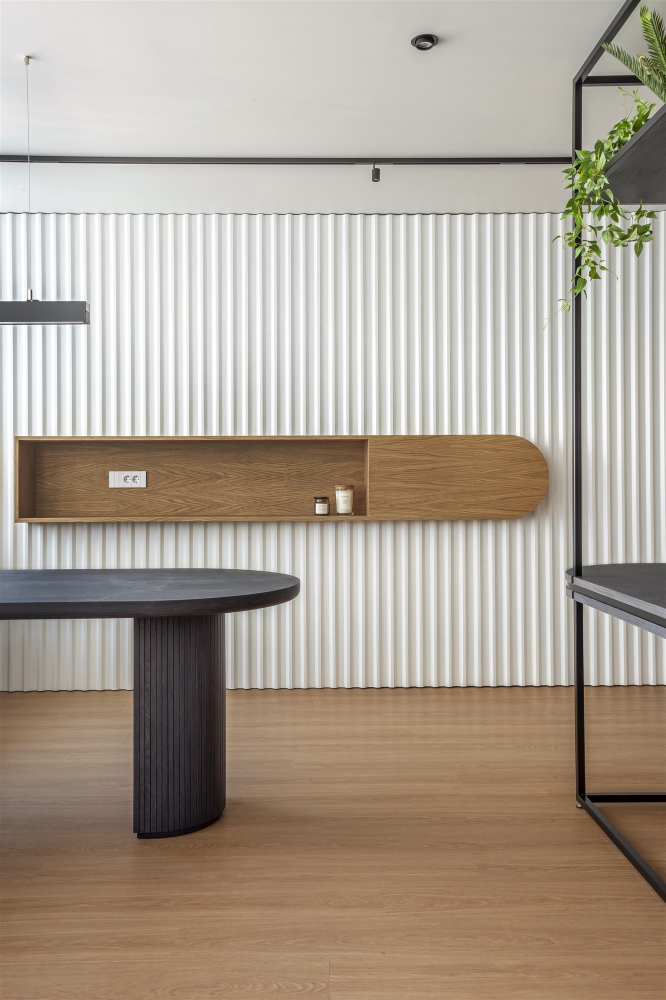Material choices are restrained yet deliberate: natural oak, black oak, and white lacquer define surfaces, while black metallic elements punctuate the space, creating quiet contrasts between structure and softness. Former partitions and doors were removed, allowing the interior to breathe, reinforcing a sense of continuity and openness.