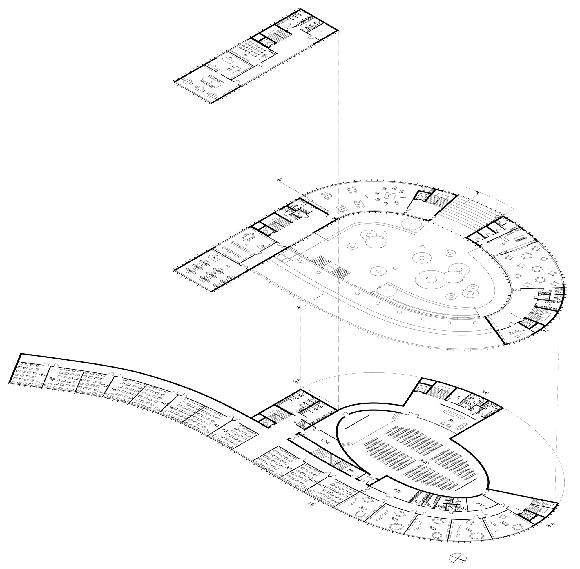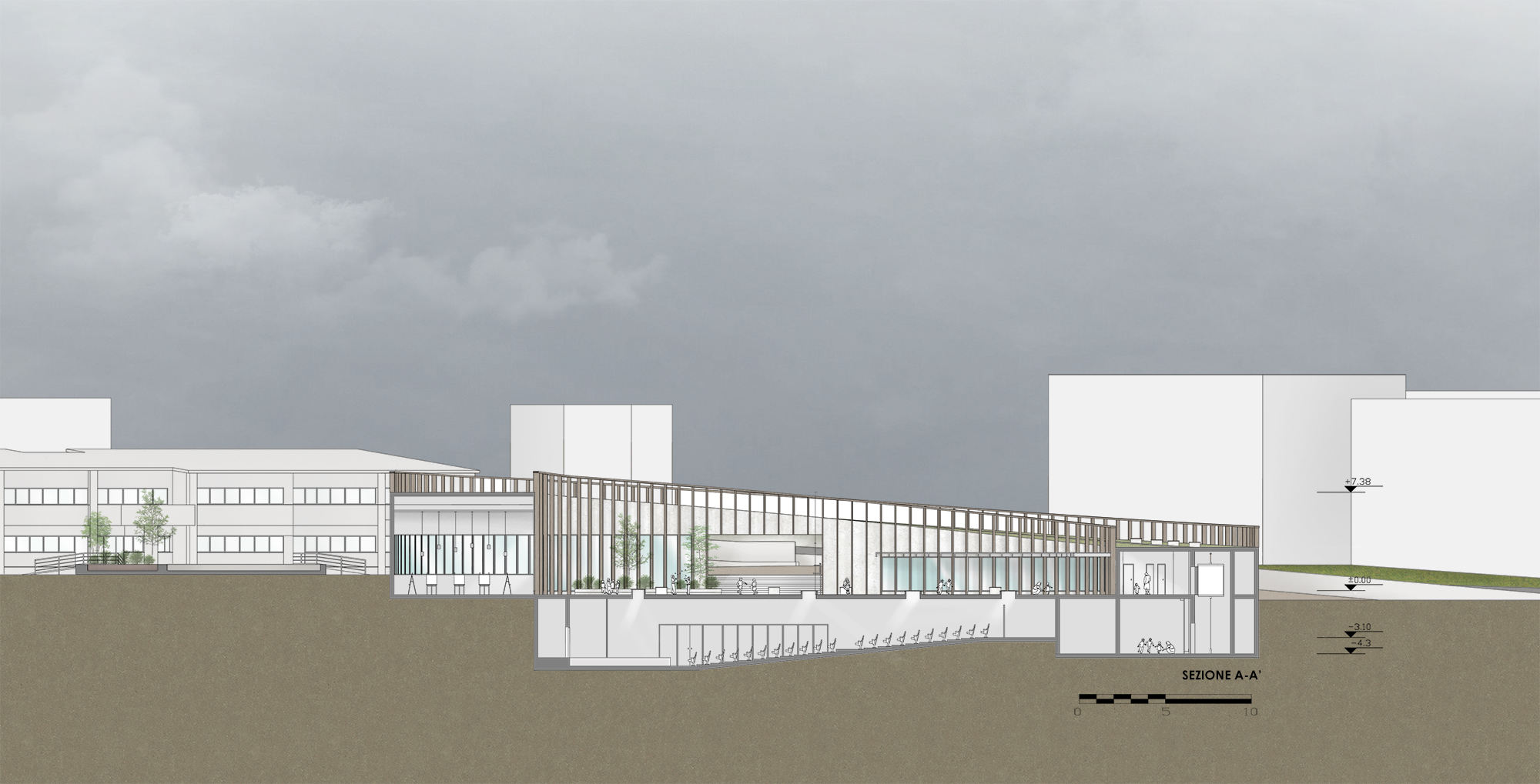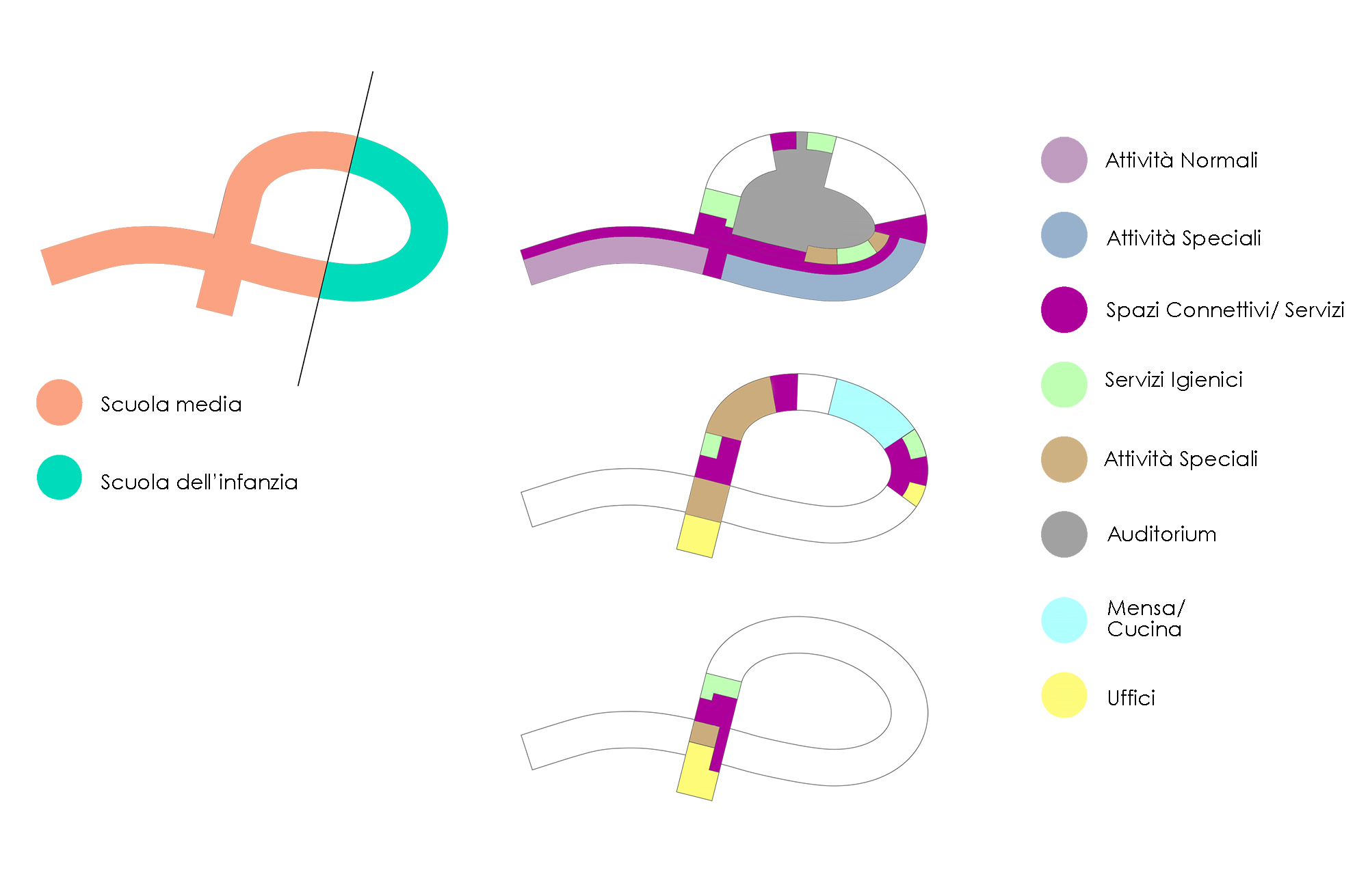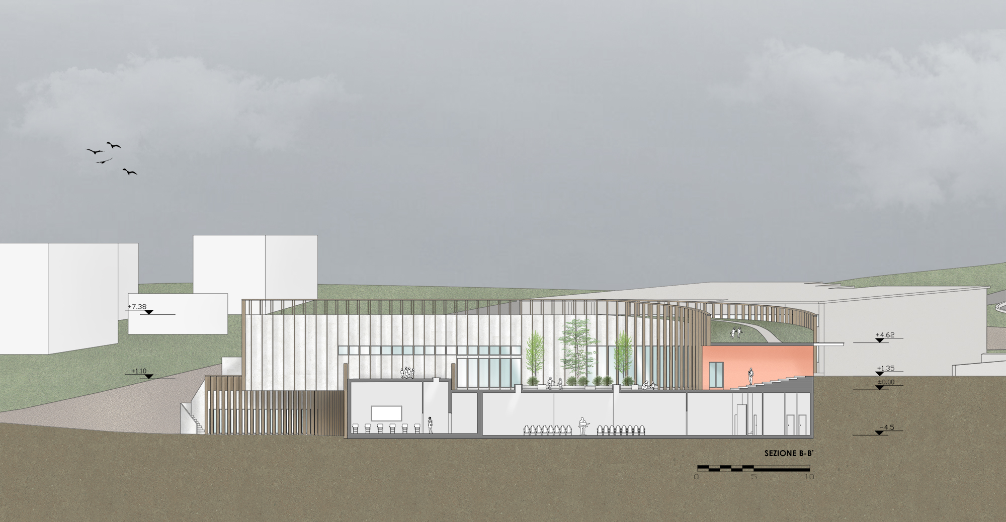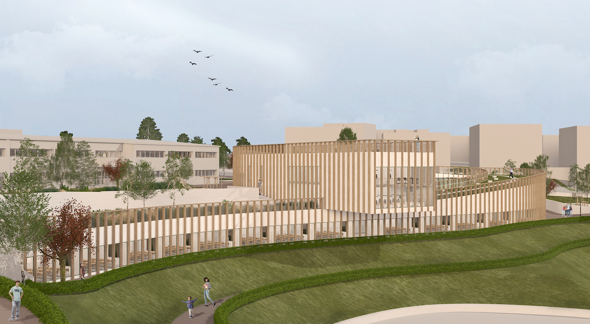The curved form of the building follows the slope of the land, enclosing a central courtyard that links the two schools. Its height gradually increases along its length, providing additional floor space while shading the courtyard from the southern sun. Separate entrances for the kindergarten and middle school, along with a central access from the northwest, support clear circulation while maintaining security.