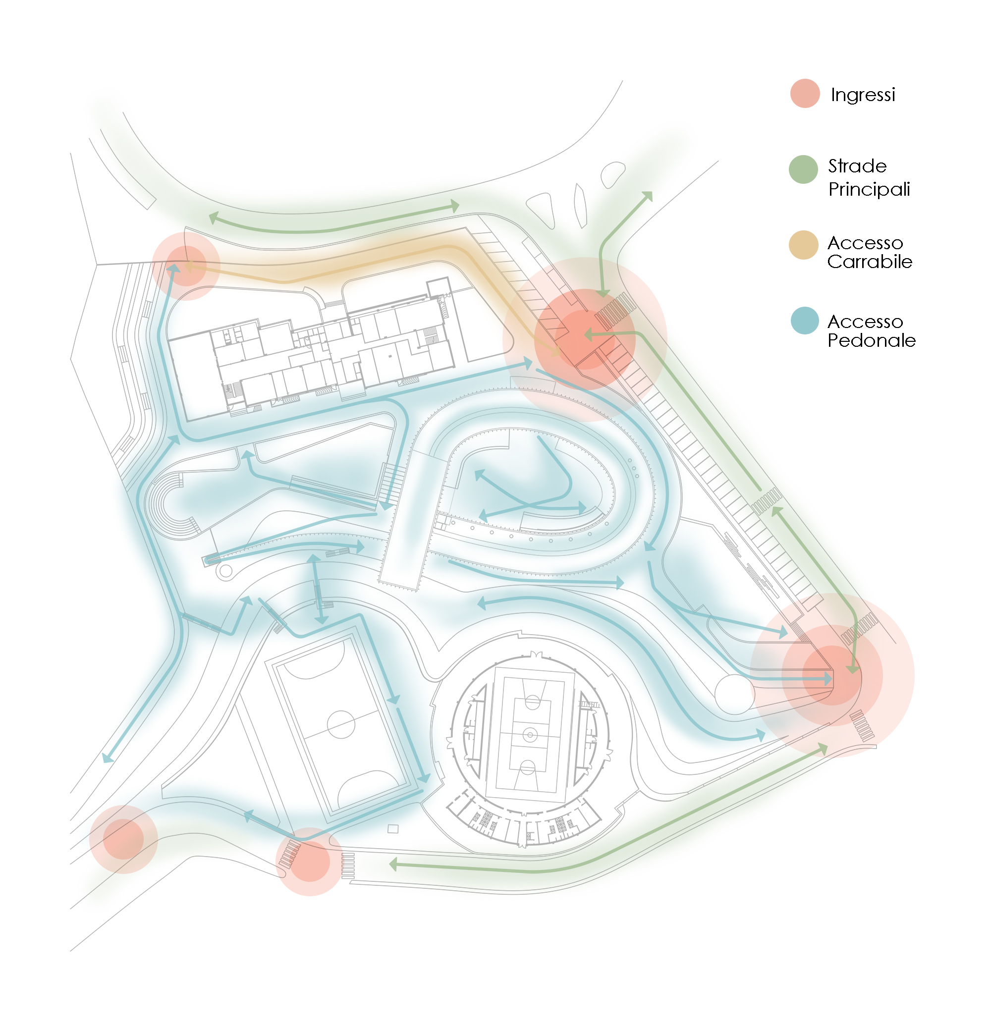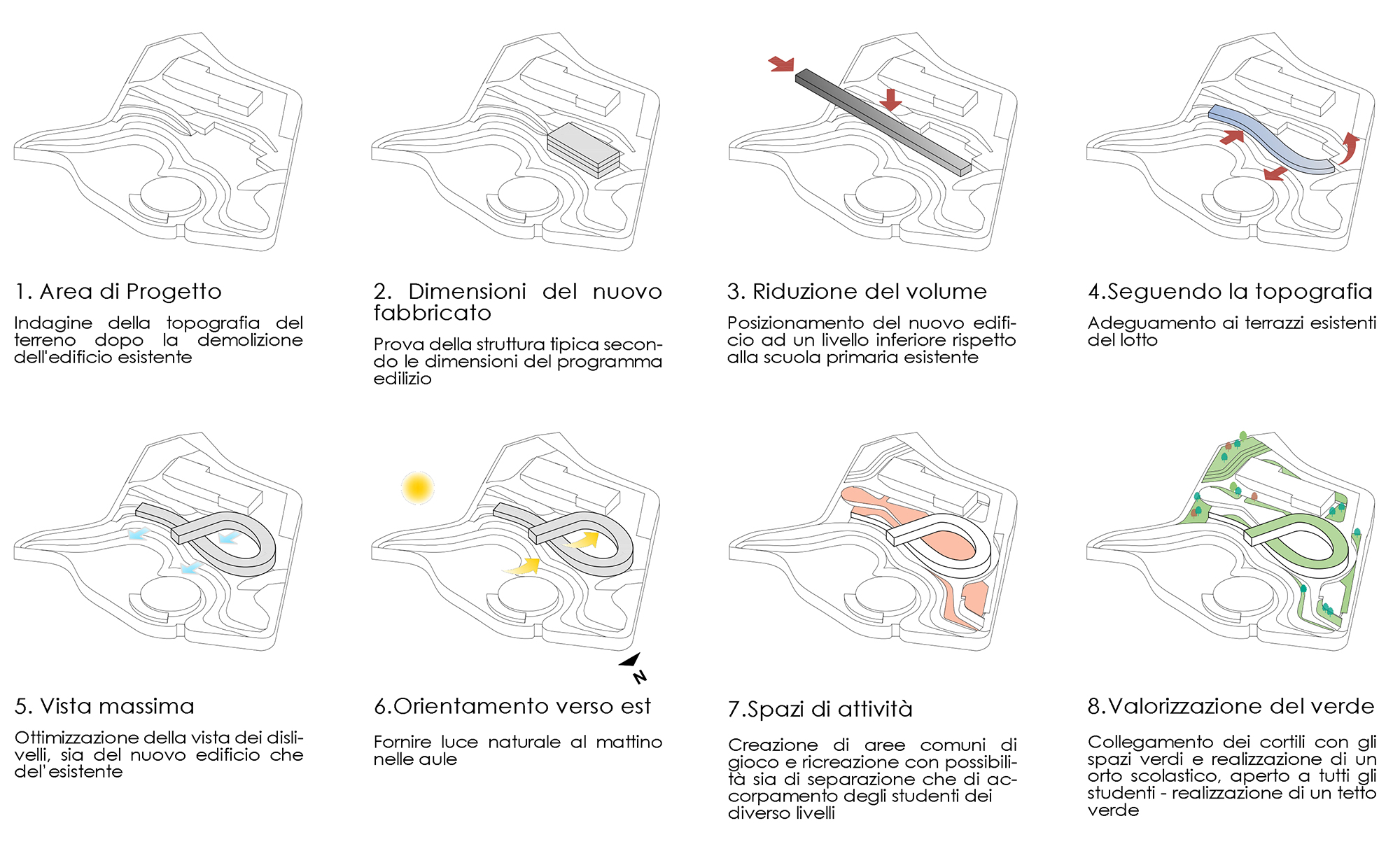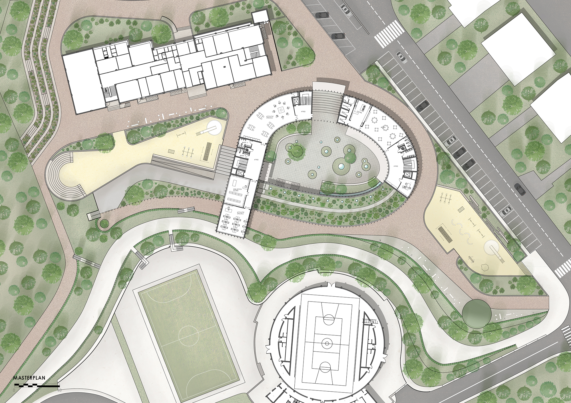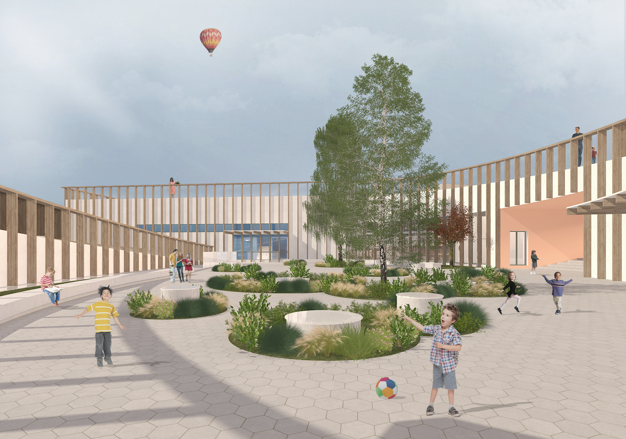 The project presents a contemporary school designed to balance safety, functionality, and playful exploration, creating a welcoming environment for both kindergarten and middle school students. The design carefully separates different functions while fostering interaction through open and covered shared spaces. It responds to programmatic needs while prioritizing the protection and well-being of younger children, integrating smoothly with the site’s sloping landscape and surrounding buildings.