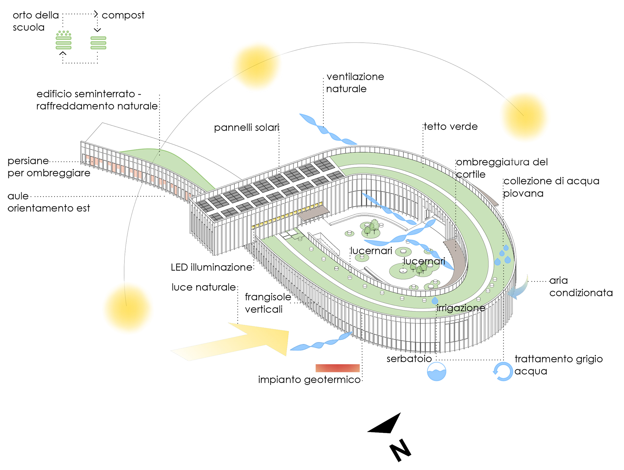 Building placement is guided by the lot’s topography and orientation. Classrooms stretch along a south-to-north axis at a slightly lower level than the primary school, ensuring morning sunlight, open views, and a natural flow through the campus. At the heart of the courtyard, a sunken auditorium is naturally lit through skylights and designed to function independently from the rest of the school.