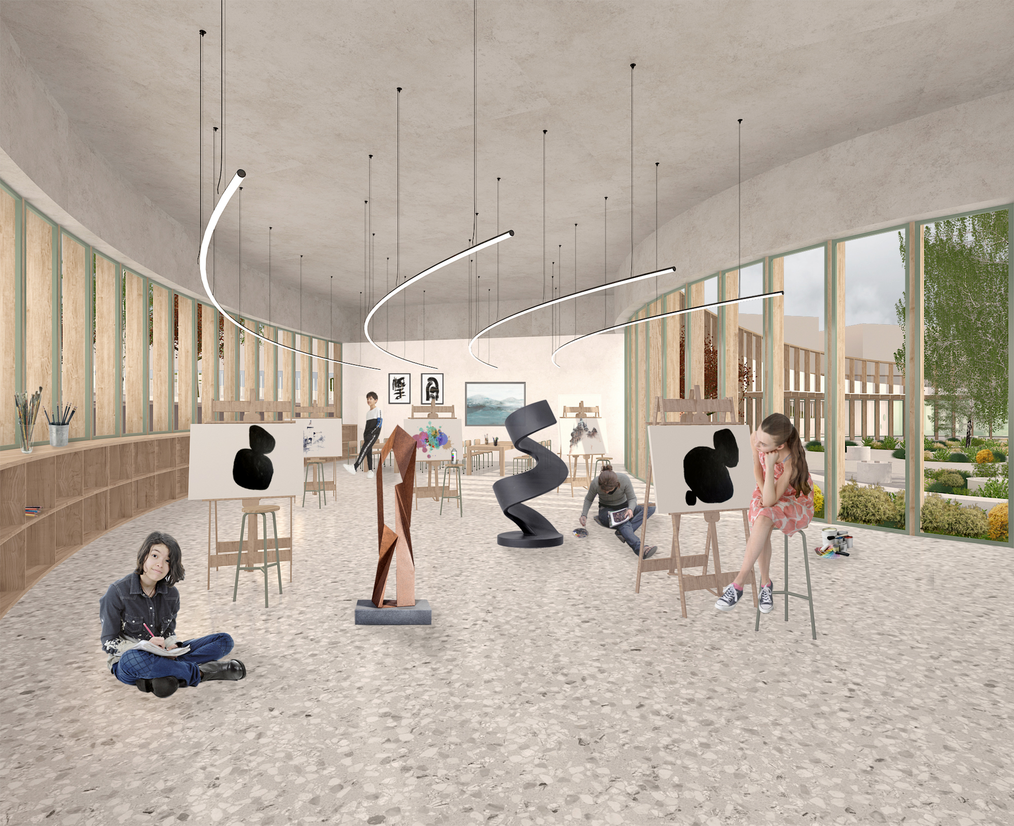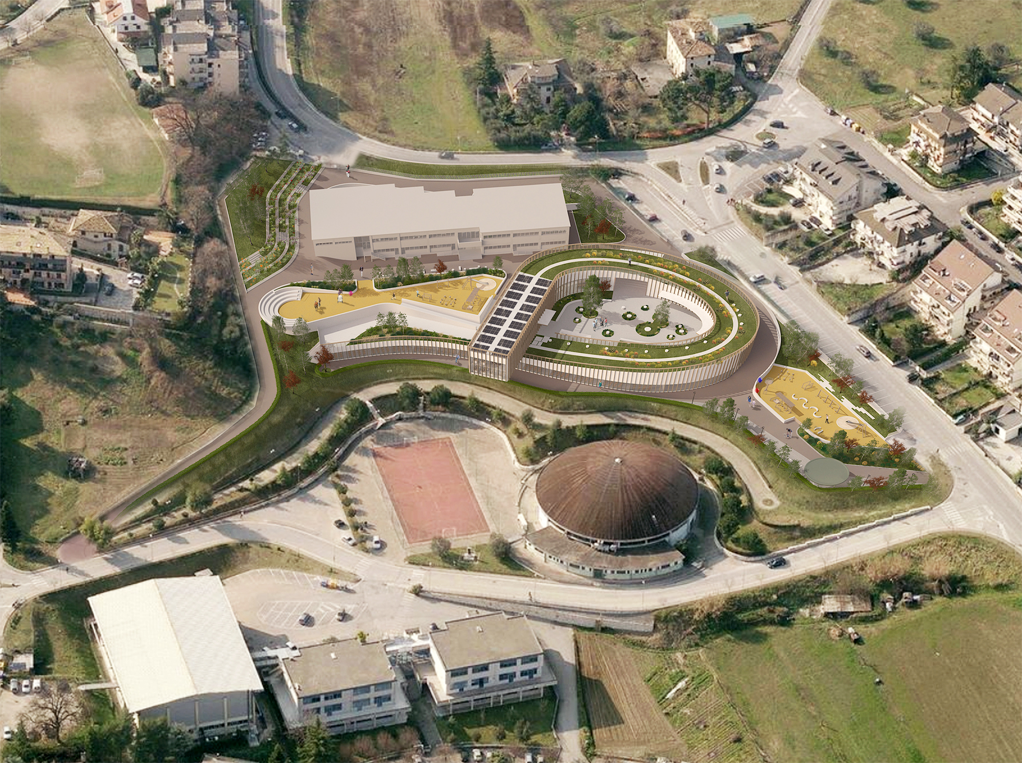 The school’s form blends with the surrounding greenery, optimizing sunlight and natural ventilation for all spaces. A green roof extends the courtyard, offering extra outdoor space, a winding pathway, and panoramic 360-degree views. More than a series of classrooms, the project is conceived as a protective, playful, and inspiring environment—where architecture encourages learning, exploration, and a strong connection to the landscape.