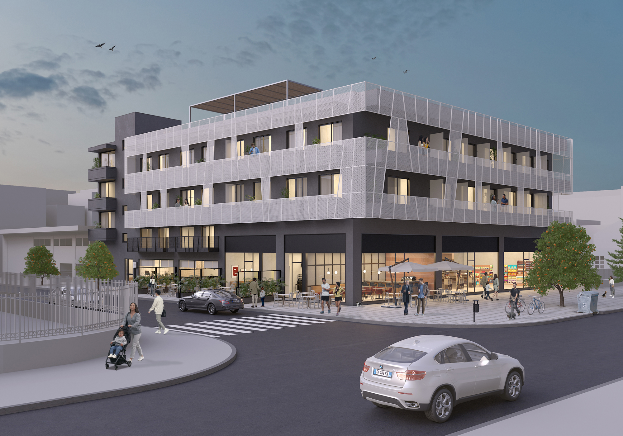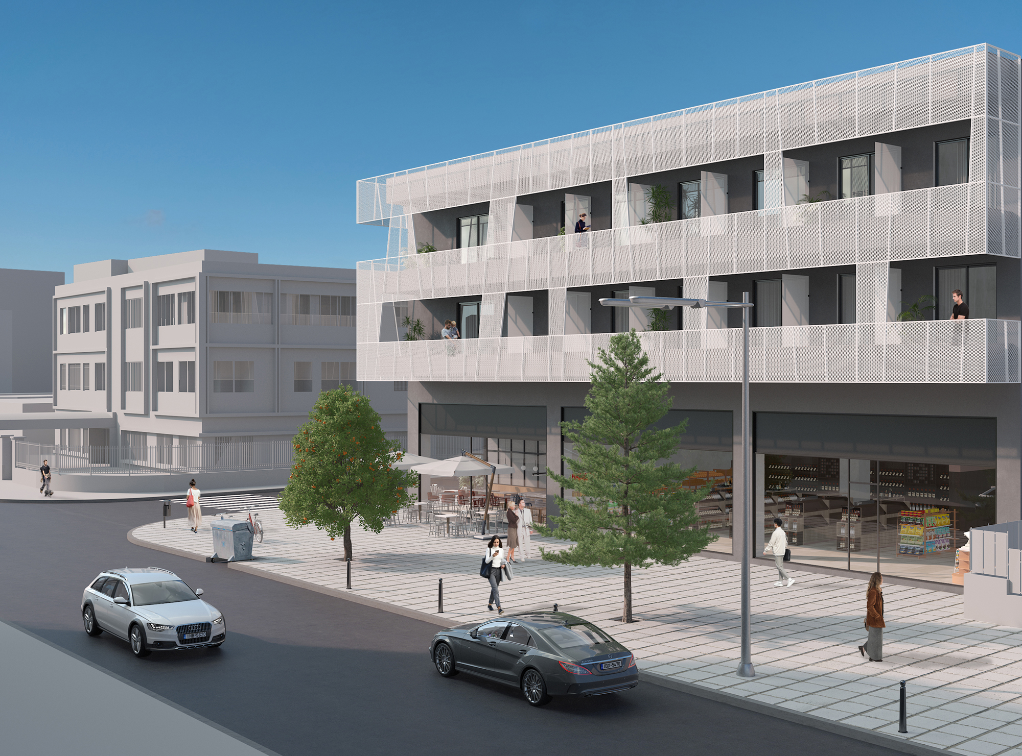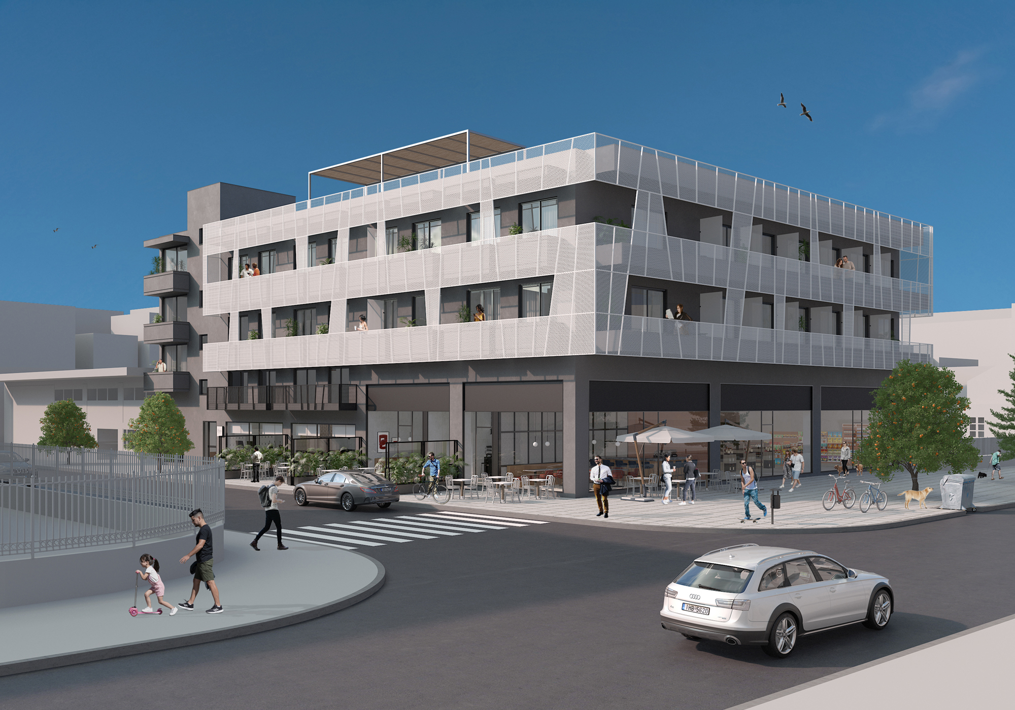 Located in the Evosmos district of western Thessaloniki, the project explores the adaptive reuse of an existing mixed-use building originally constructed in the early 1980s. The intervention retains the active commercial character of the ground floor and mezzanine, while transforming the first and second floors into 37 compact apartments designed for long-term leasing, addressing contemporary housing needs within a dense urban context.