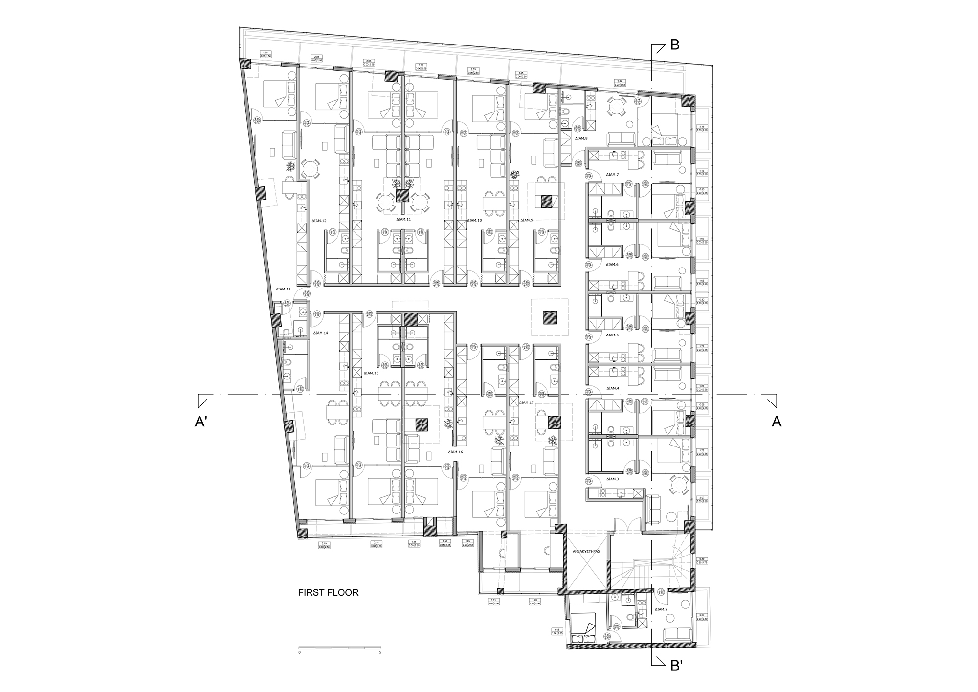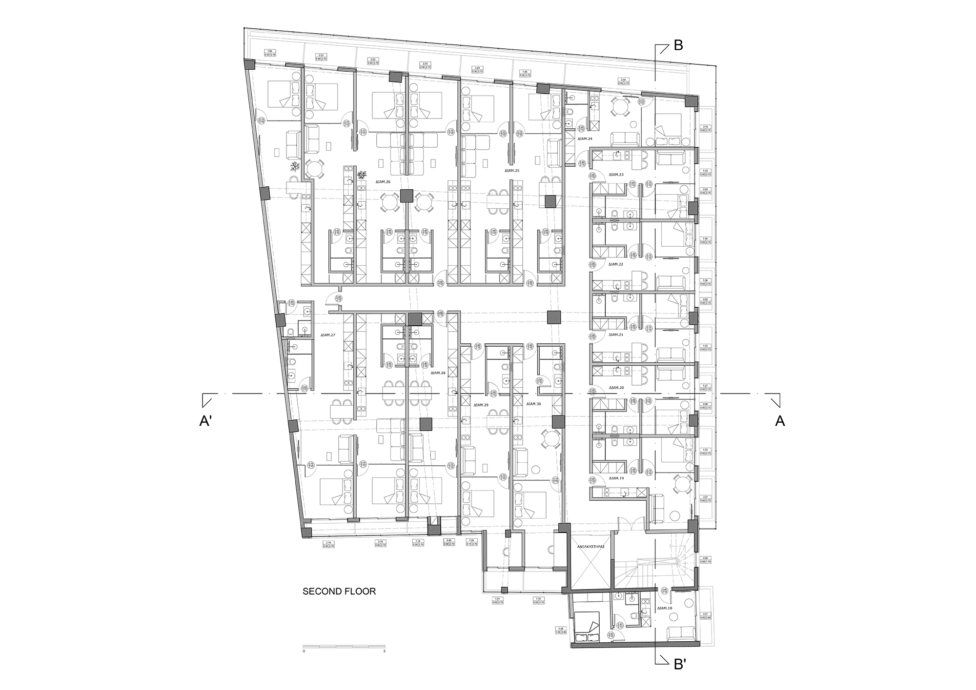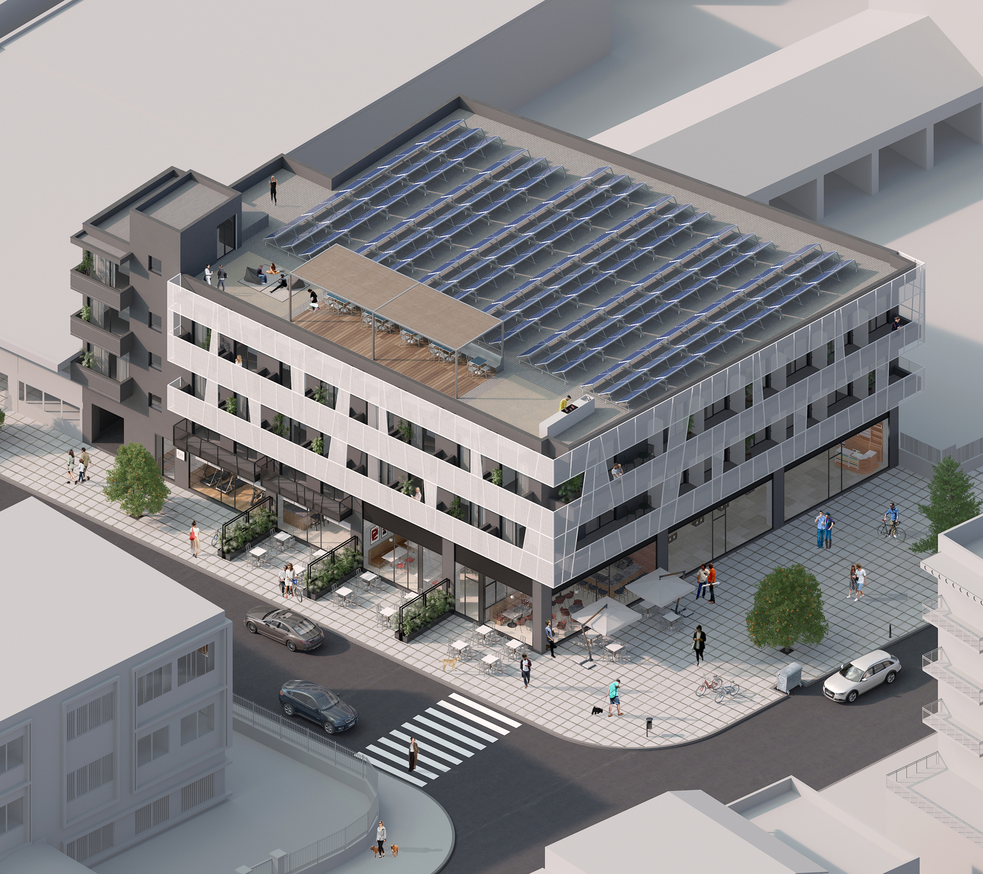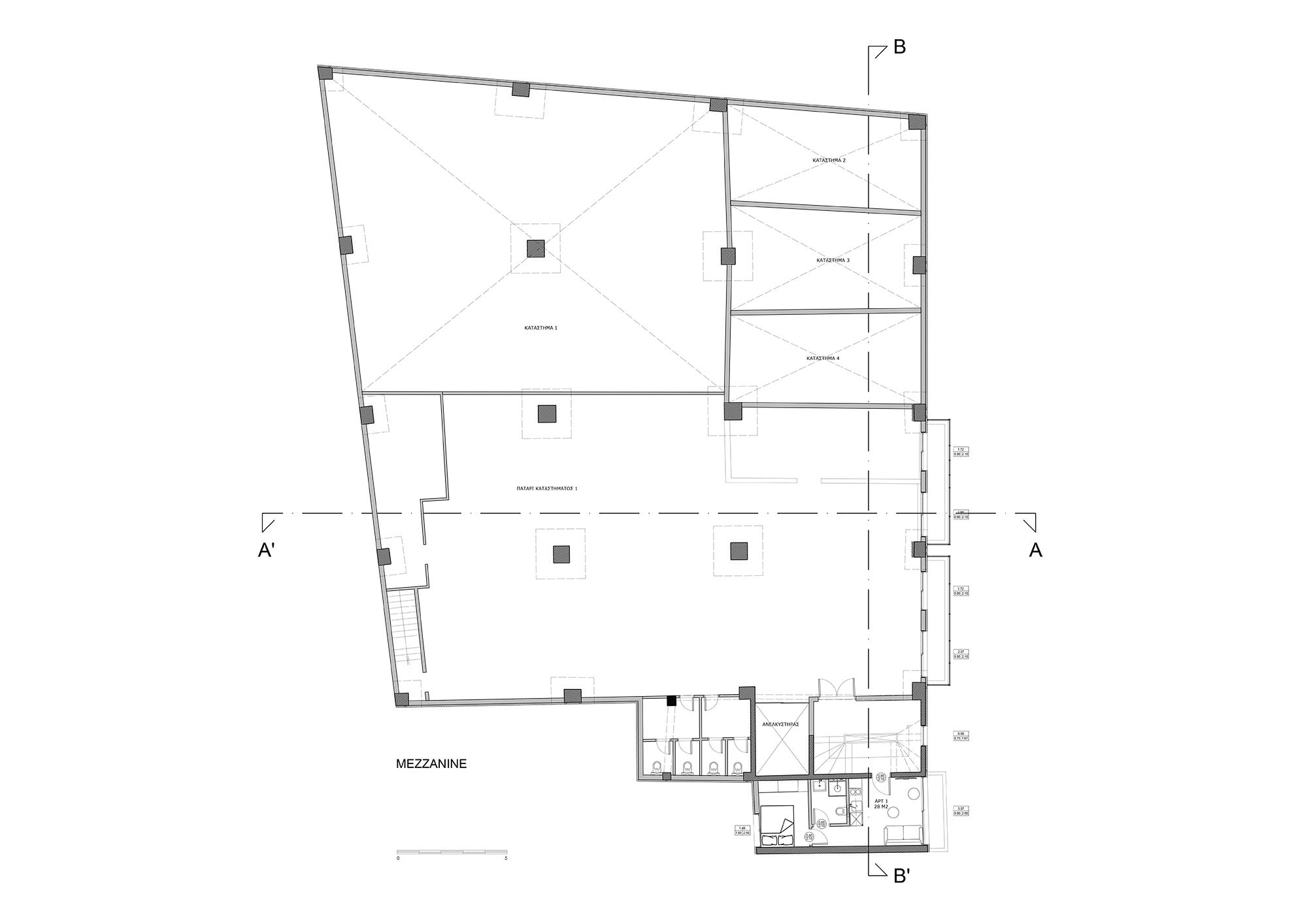 Located in the Evosmos district of western Thessaloniki, the project explores the adaptive reuse of an existing mixed-use building originally constructed in the early 1980s. The intervention retains the active commercial character of the ground floor and mezzanine, while transforming the first and second floors into 37 compact apartments designed for long-term leasing, addressing contemporary housing needs within a dense urban context.