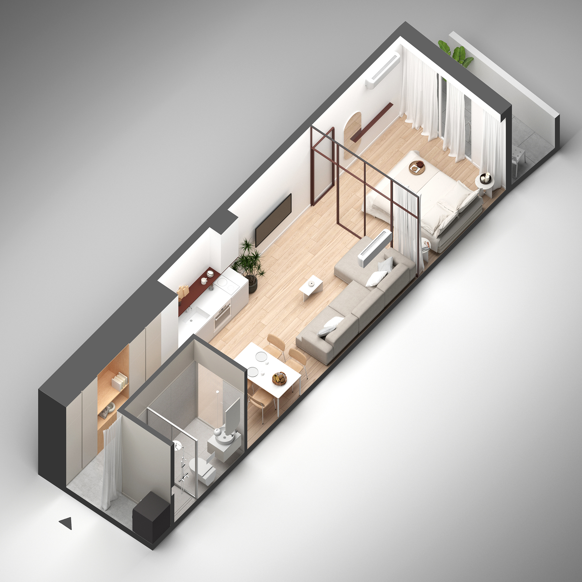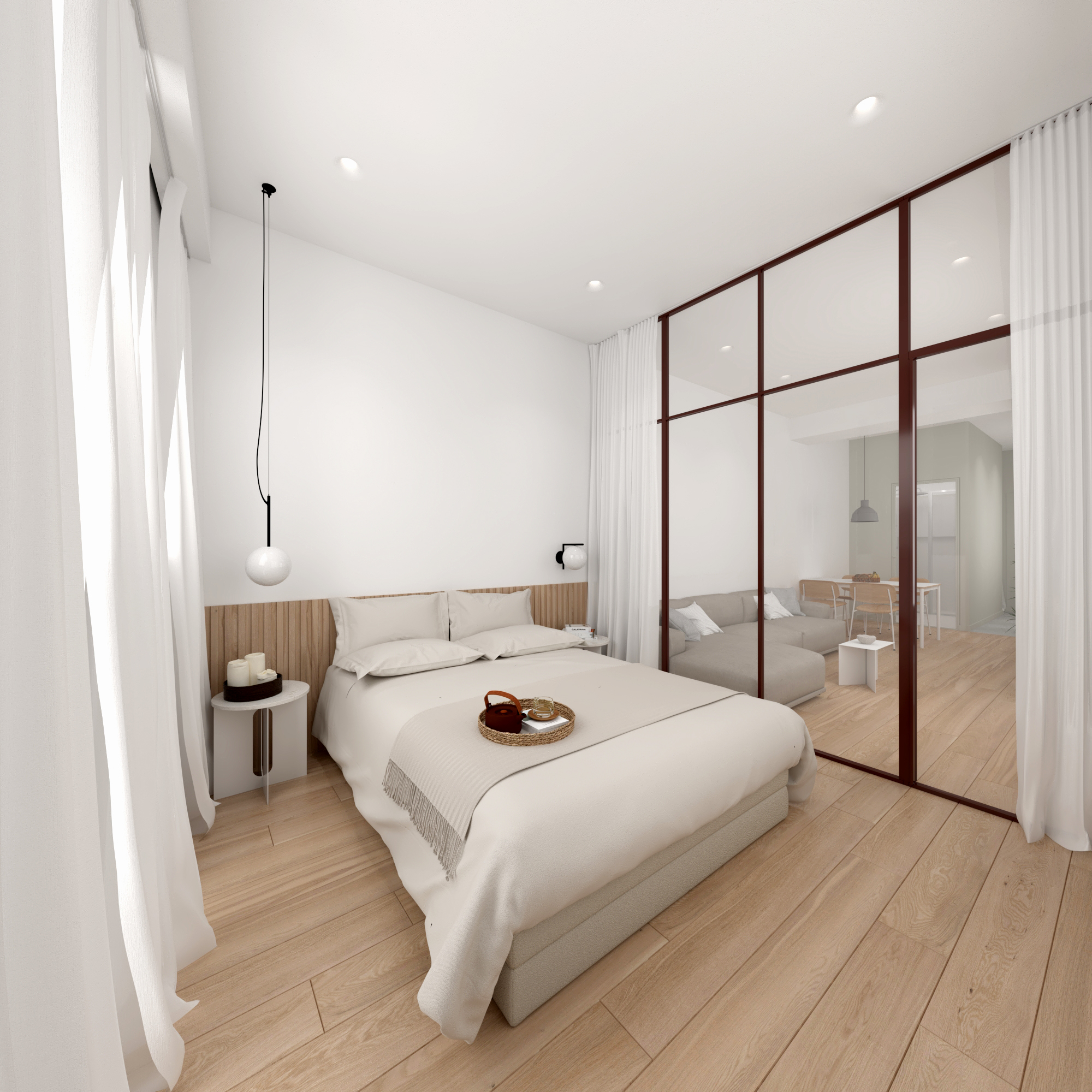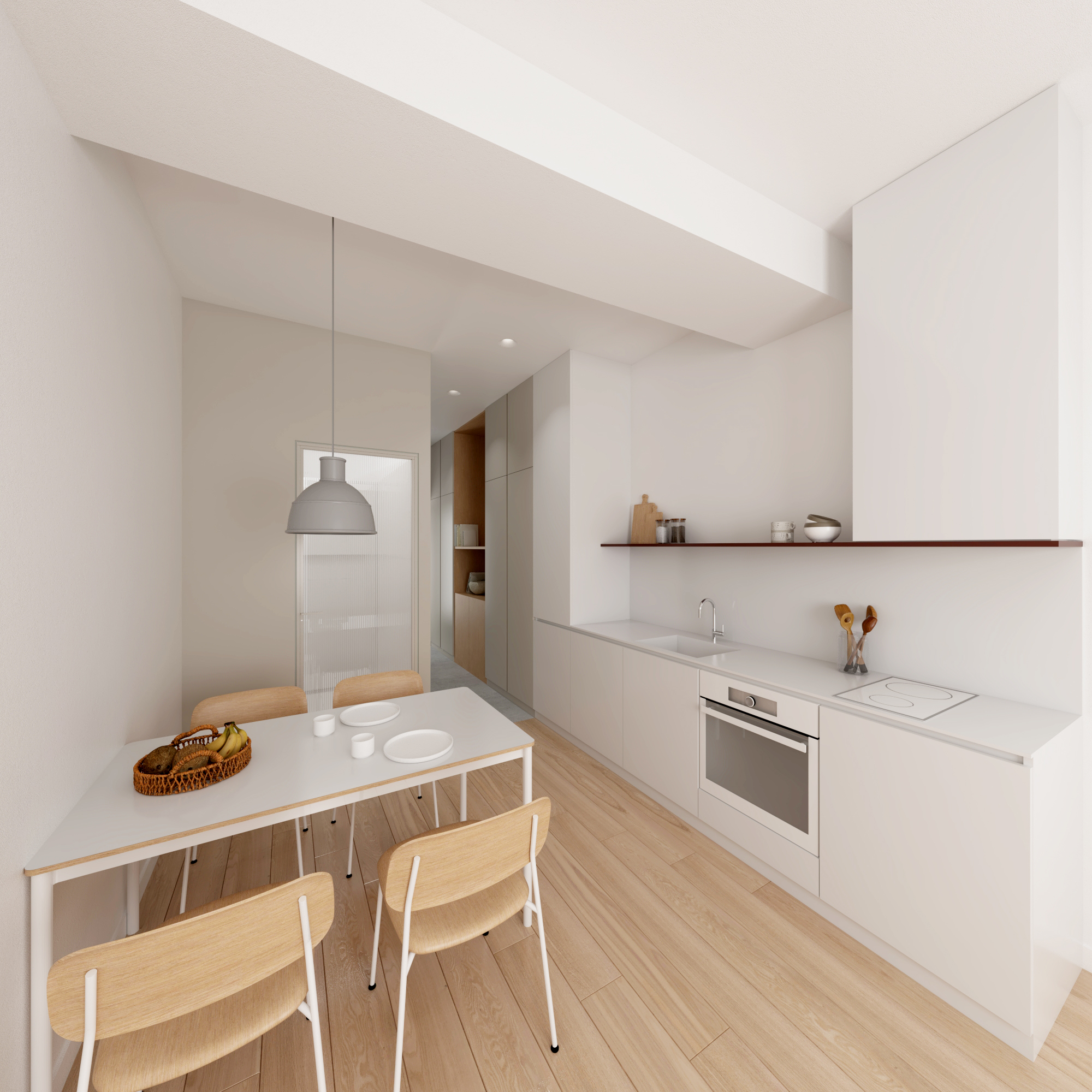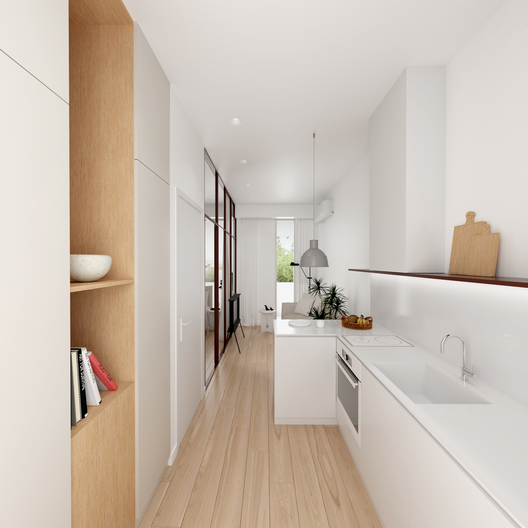 Residential units are conceived as compact and flexible living frameworks, where daylight, circulation, and adaptability inform spatial organization. Interiors are arranged to maximize clarity and ease of use, accommodating diverse living patterns. Material choices emphasize durability and comfort: dark surfaces contrast with white metallic elements on the exterior, while interiors combine light tones with natural oak flooring to create a calm, minimal atmosphere. Three one-bedroom typologies structure the residential program, with selected units incorporating transparent red metal dividers that filter light and subtly define space.