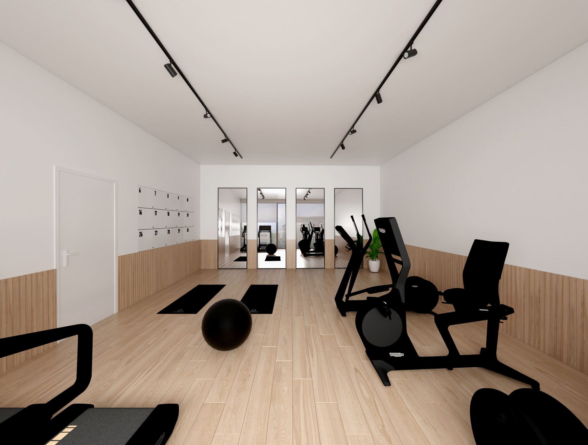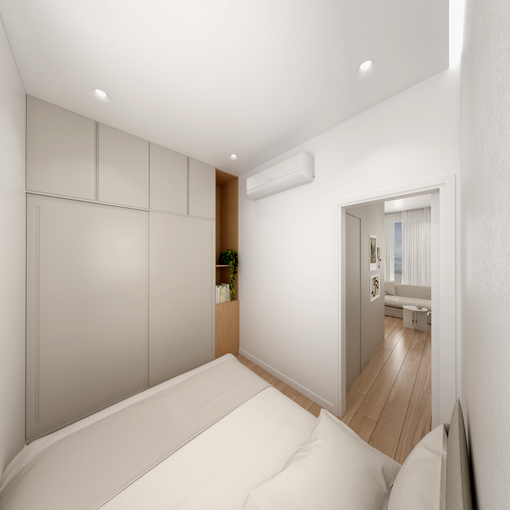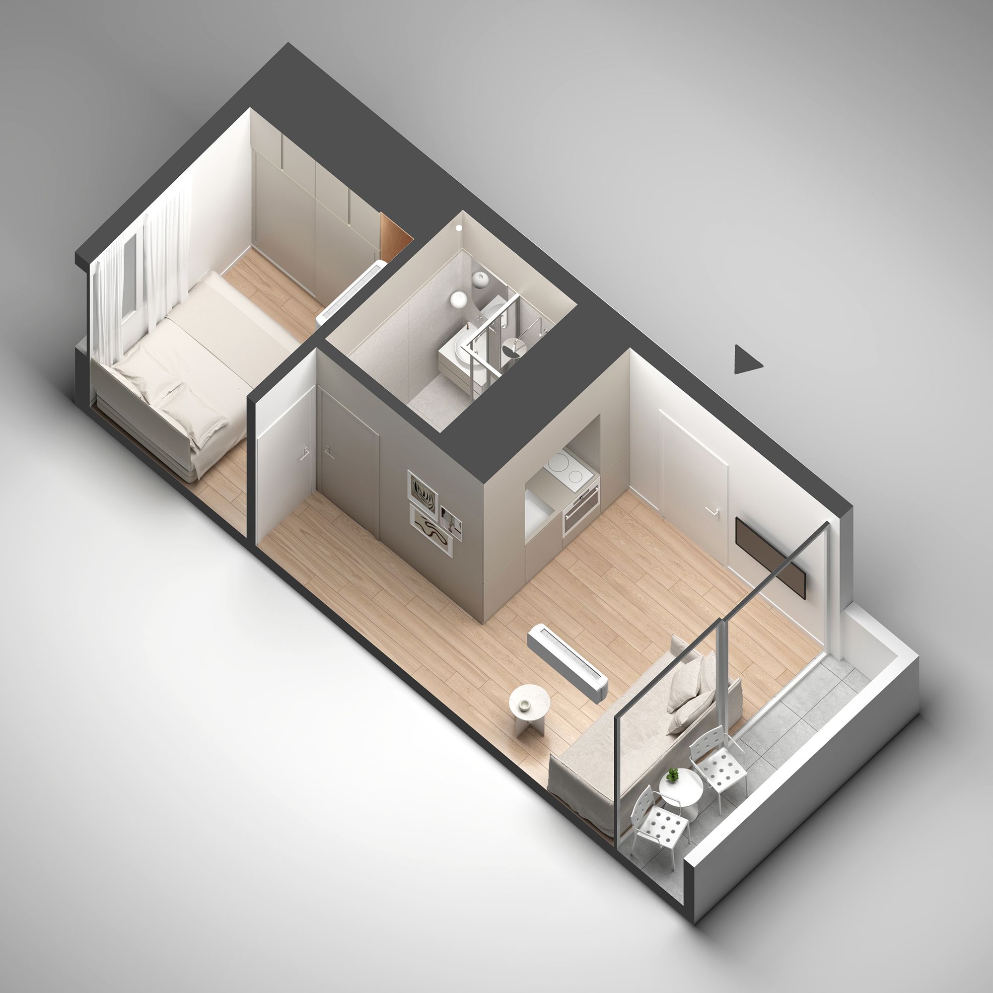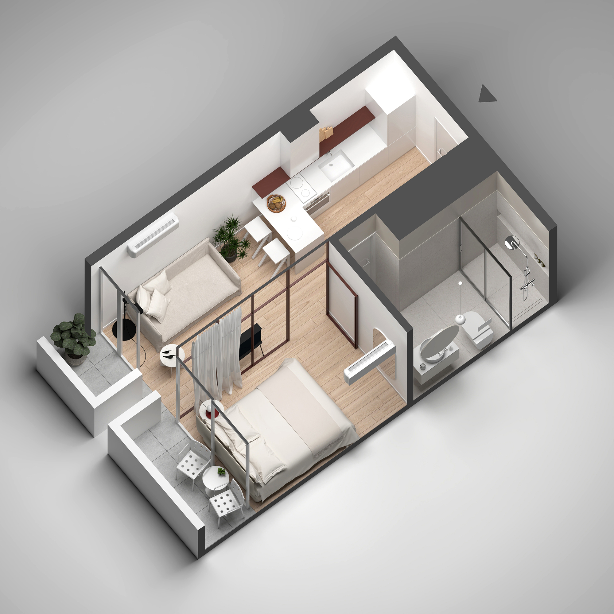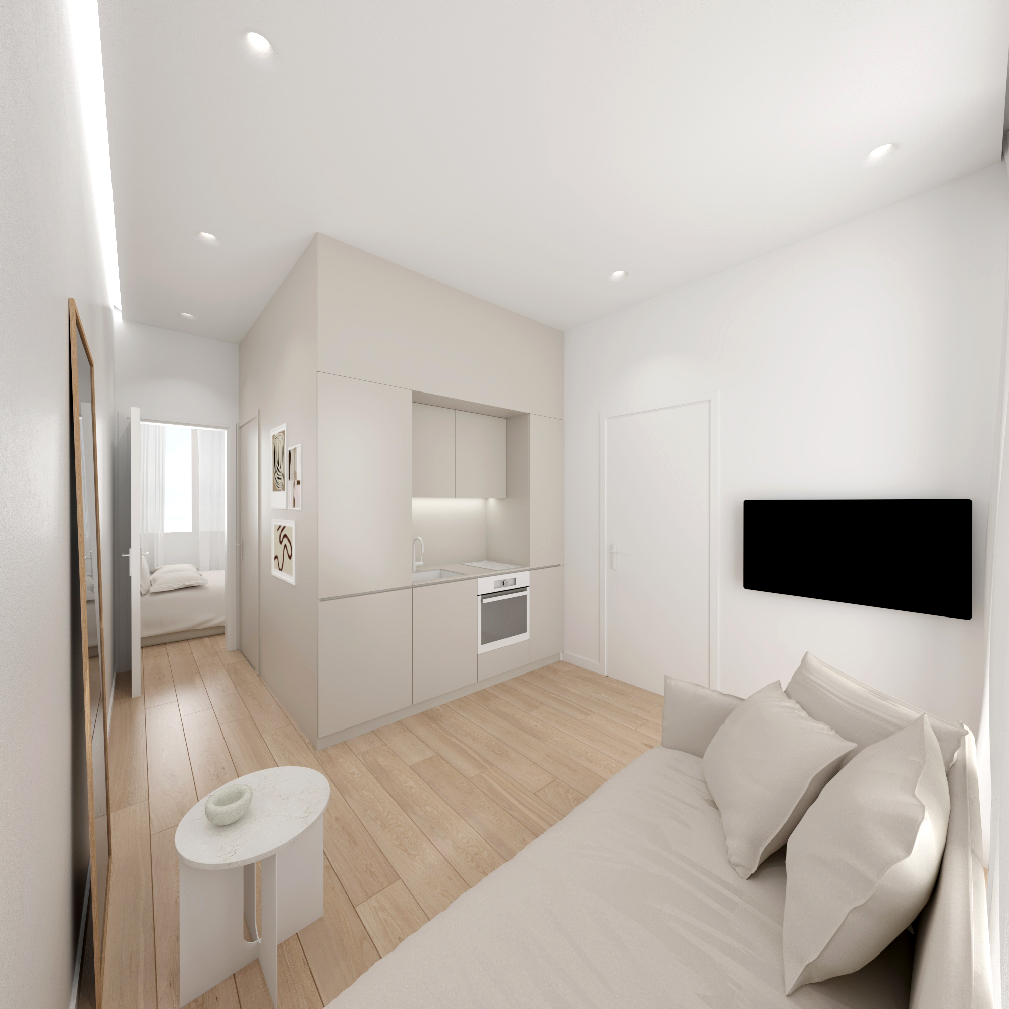Residential units are conceived as compact and flexible living frameworks, where daylight, circulation, and adaptability inform spatial organization. Interiors are arranged to maximize clarity and ease of use, accommodating diverse living patterns. Material choices emphasize durability and comfort: dark surfaces contrast with white metallic elements on the exterior, while interiors combine light tones with natural oak flooring to create a calm, minimal atmosphere. Three one-bedroom typologies structure the residential program, with selected units incorporating transparent red metal dividers that filter light and subtly define space.