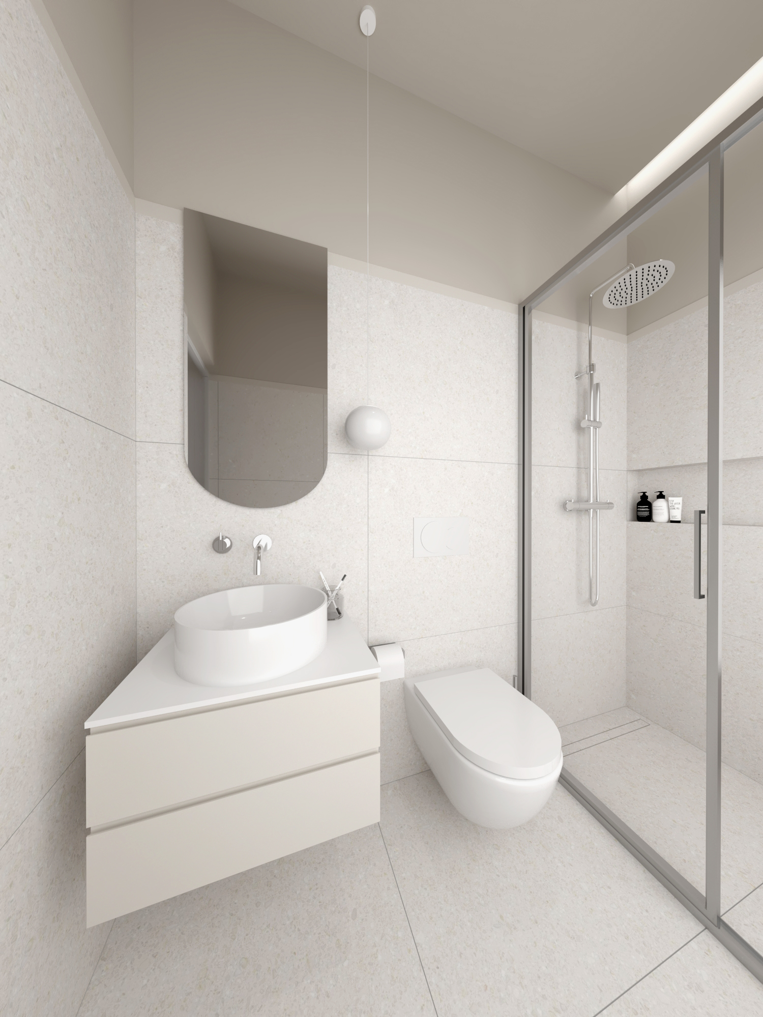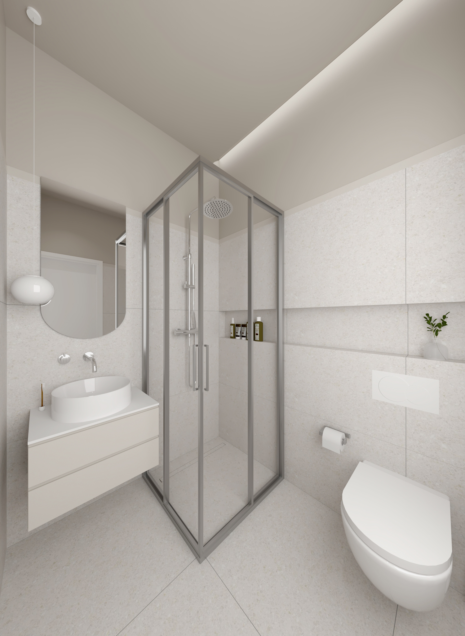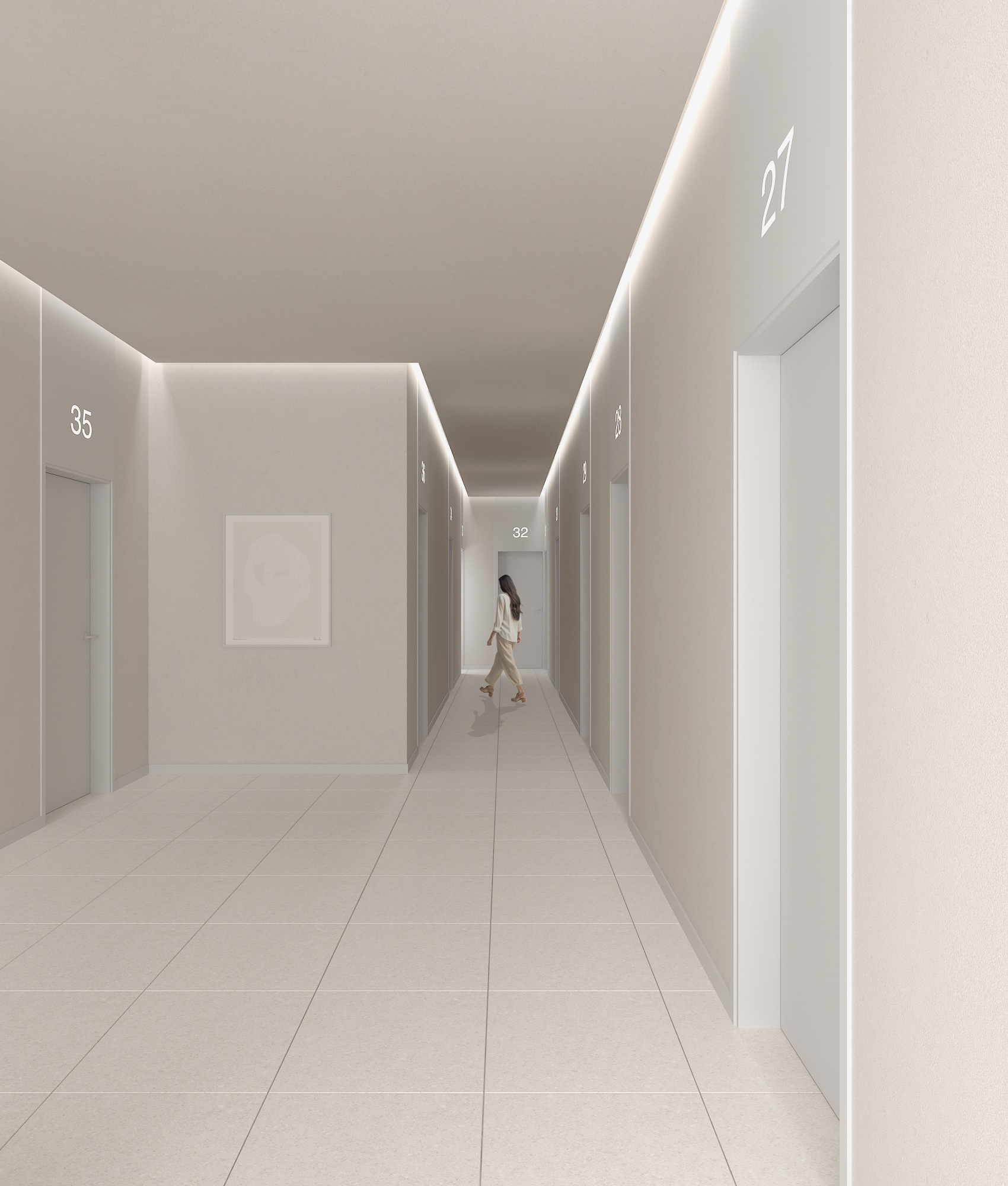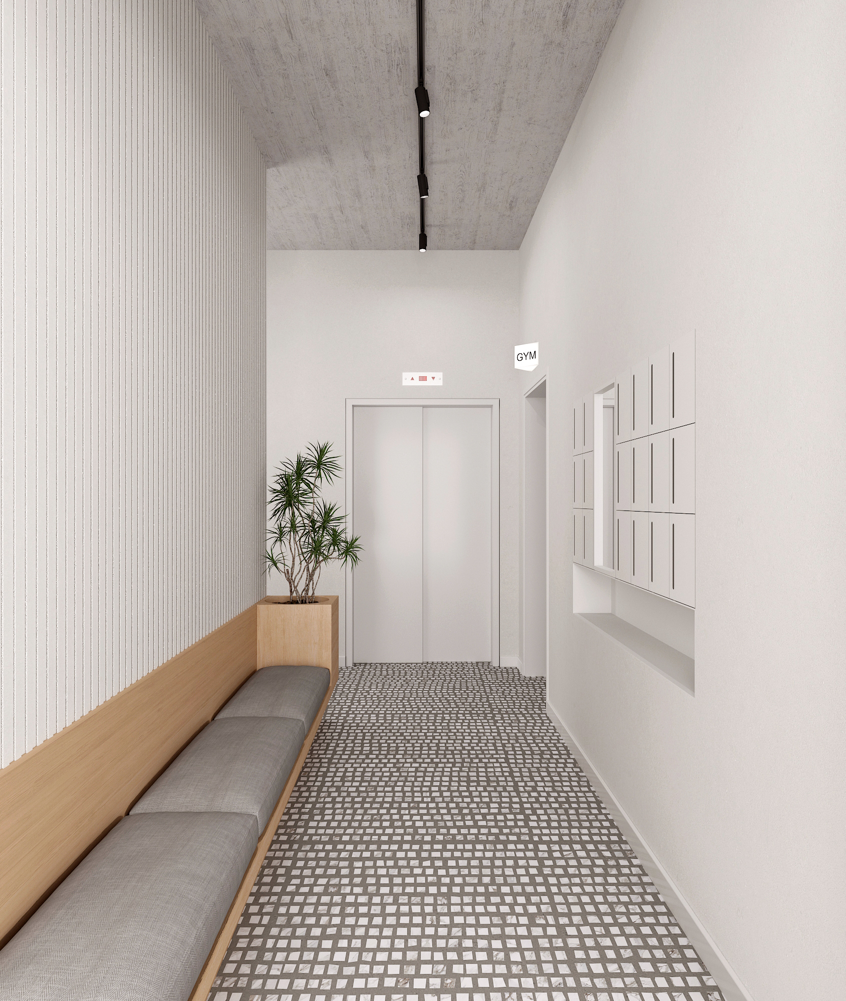 Residential units are conceived as compact and flexible living frameworks, where daylight, circulation, and adaptability inform spatial organization. Interiors are arranged to maximize clarity and ease of use, accommodating diverse living patterns. Material choices emphasize durability and comfort: dark surfaces contrast with white metallic elements on the exterior, while interiors combine light tones with natural oak flooring to create a calm, minimal atmosphere. Three one-bedroom typologies structure the residential program, with selected units incorporating transparent red metal dividers that filter light and subtly define space.