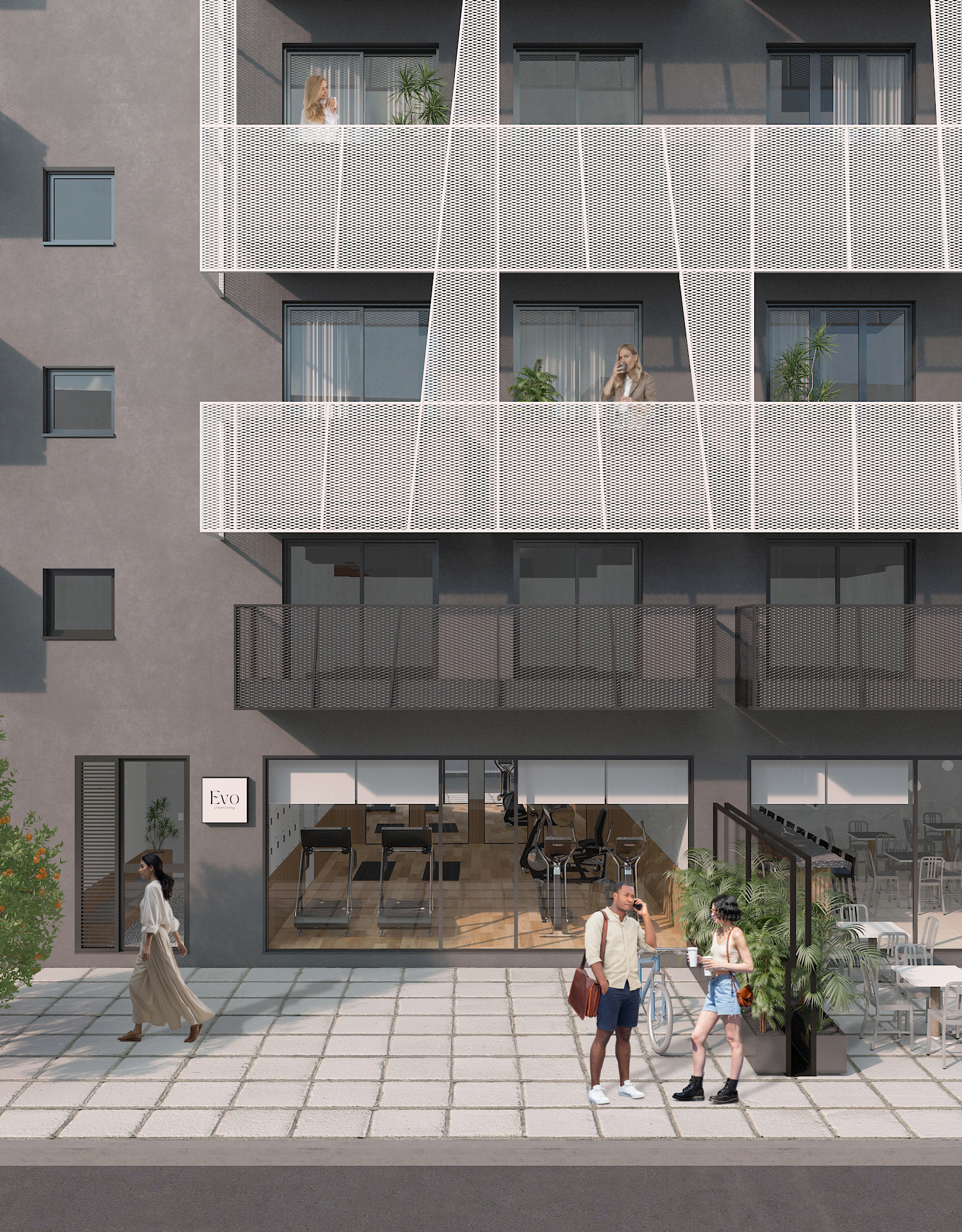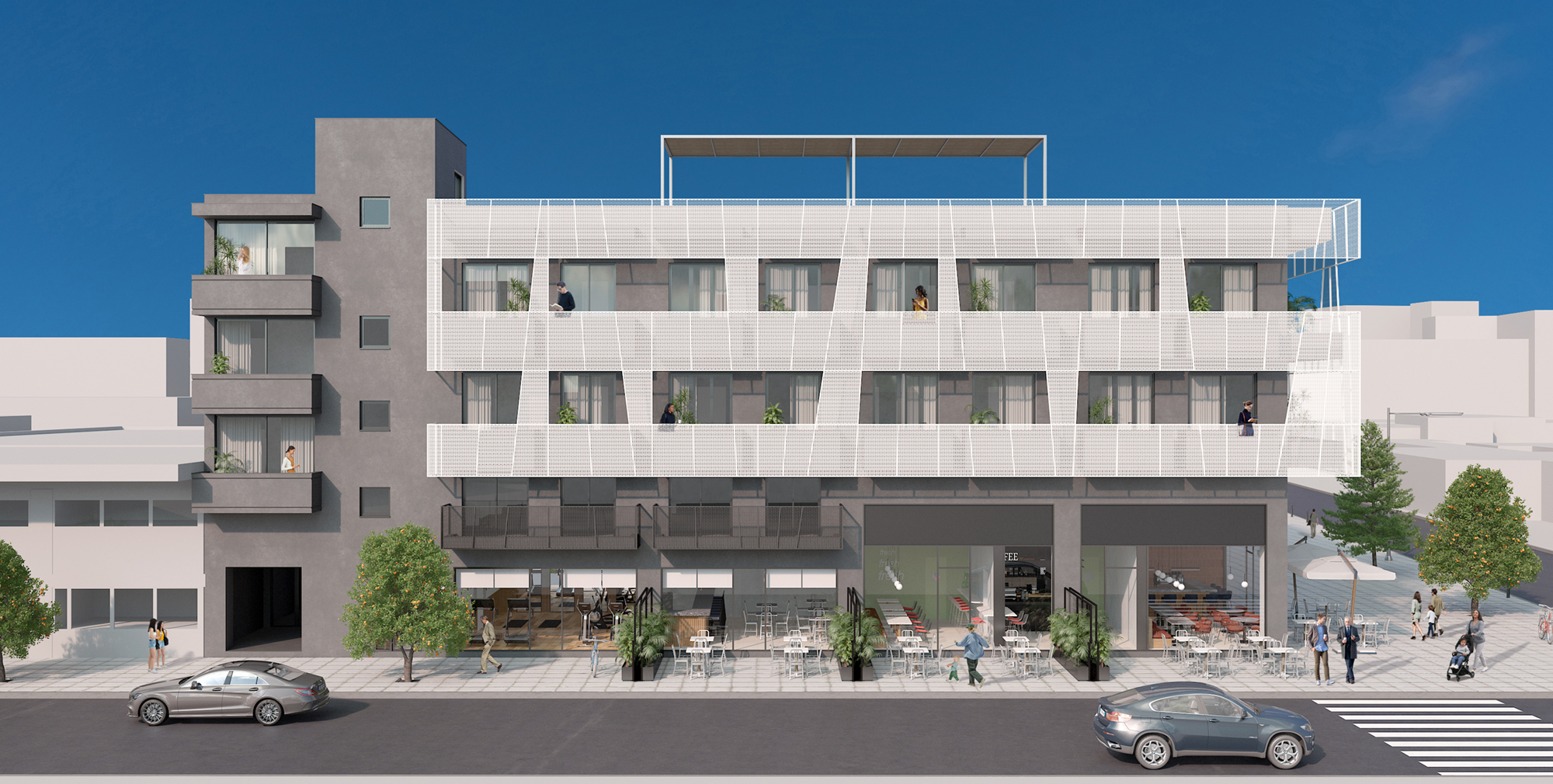 A new continuous façade layer consolidates the building’s previously fragmented balconies into a unified architectural system. This semi-transparent second skin functions as an inhabited threshold, regulating light, privacy, and climate while establishing a clear and recognizable identity within the surrounding fabric.