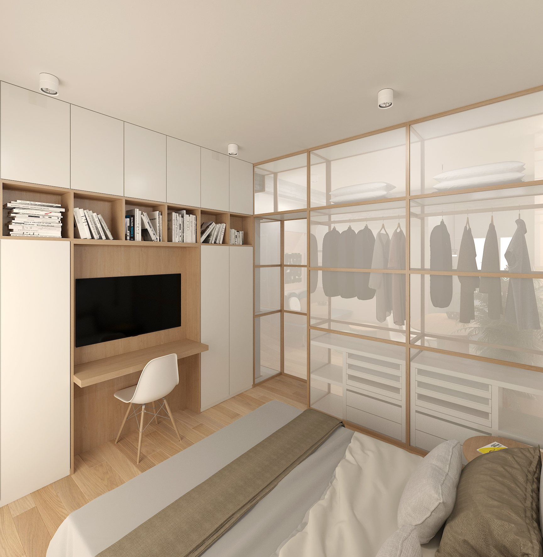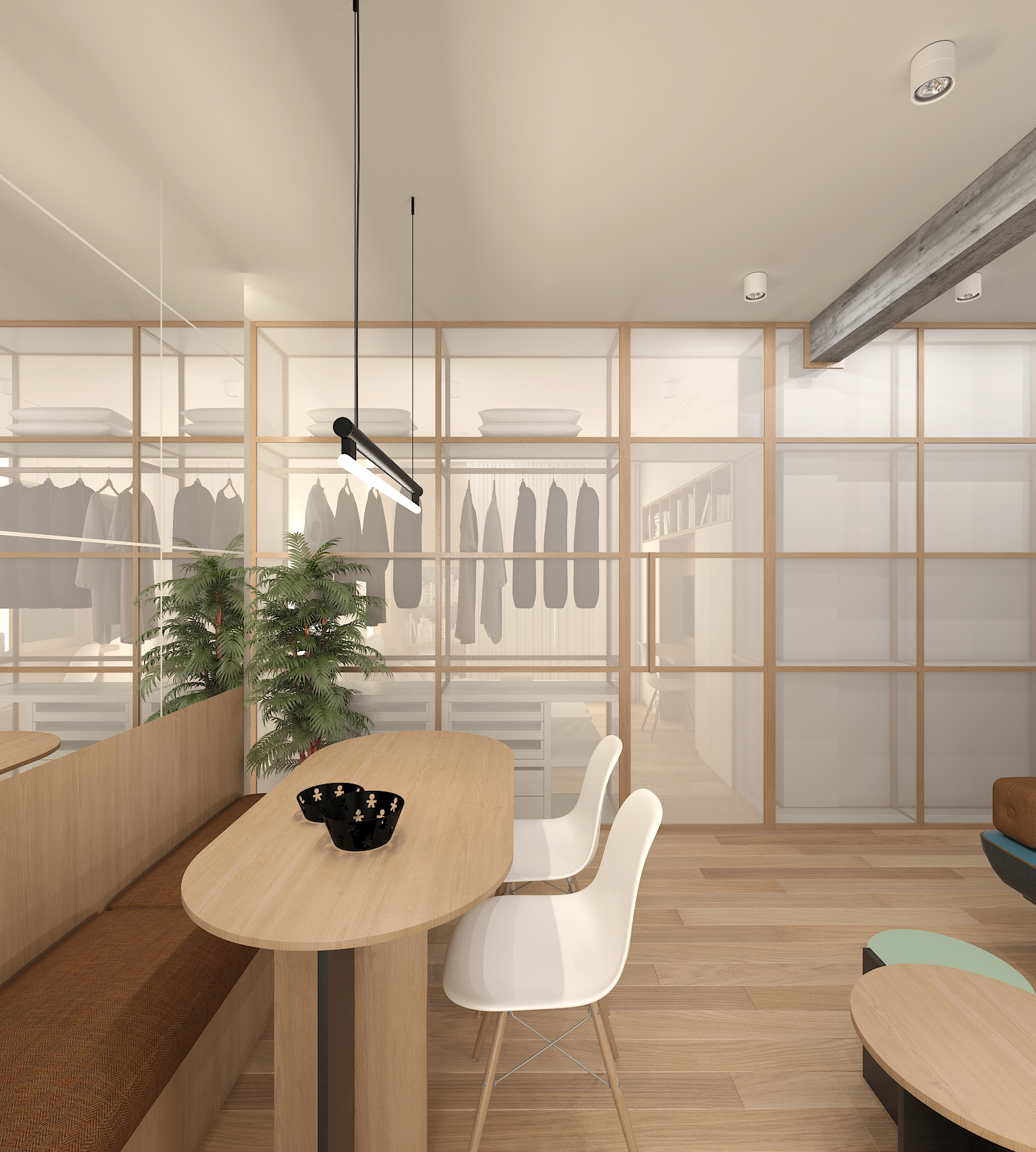 White surfaces and polycarbonate panels amplify light, while mirrors create a sense of expansiveness. Warm oak floors, wall panels, and custom furniture contrast with occasional vivid upholstery and black iron bathroom elements, balancing coziness with clarity. Every piece, aside from chairs, is a bespoke design crafted for the space, creating a minimal, bright, and highly functional interior.
