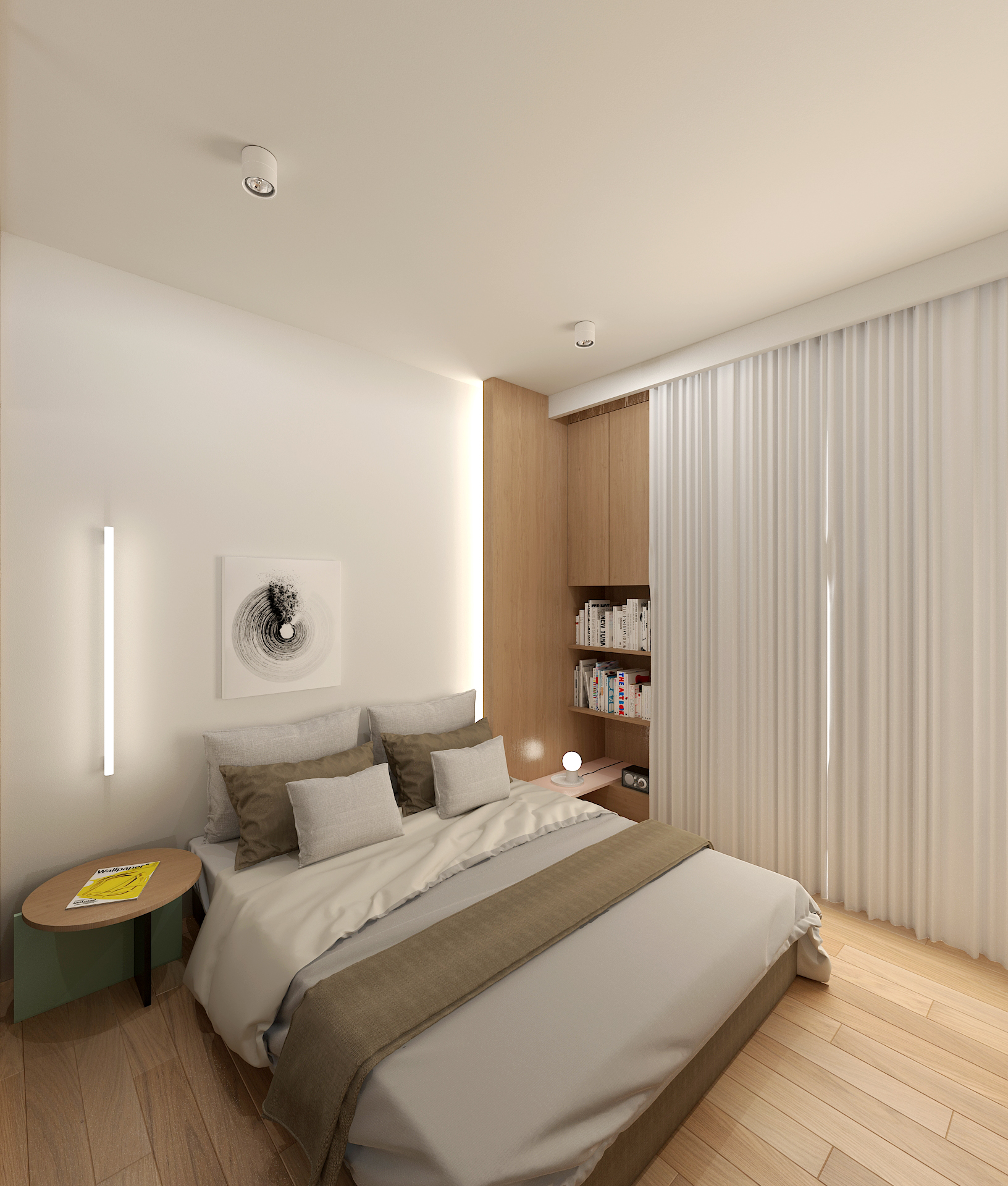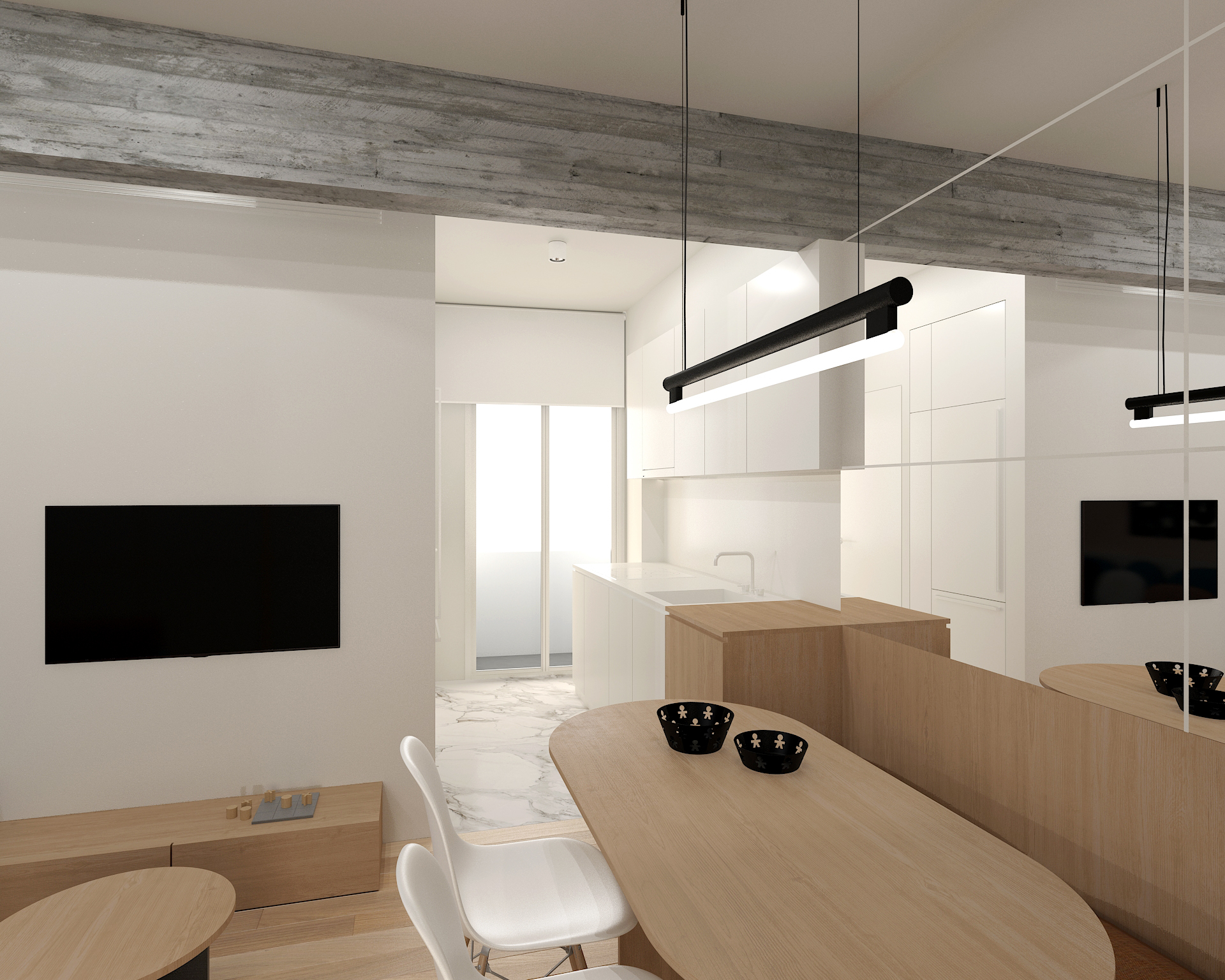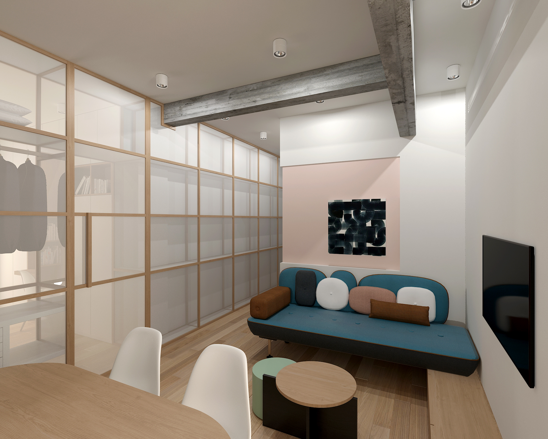 Located on the fourth floor of a 1960s residential building in Thessaloniki, this one-bedroom apartment was reimagined for contemporary short-term rental living. The redesign prioritizes natural light, functional layout, and ample storage while maintaining the original spatial logic.