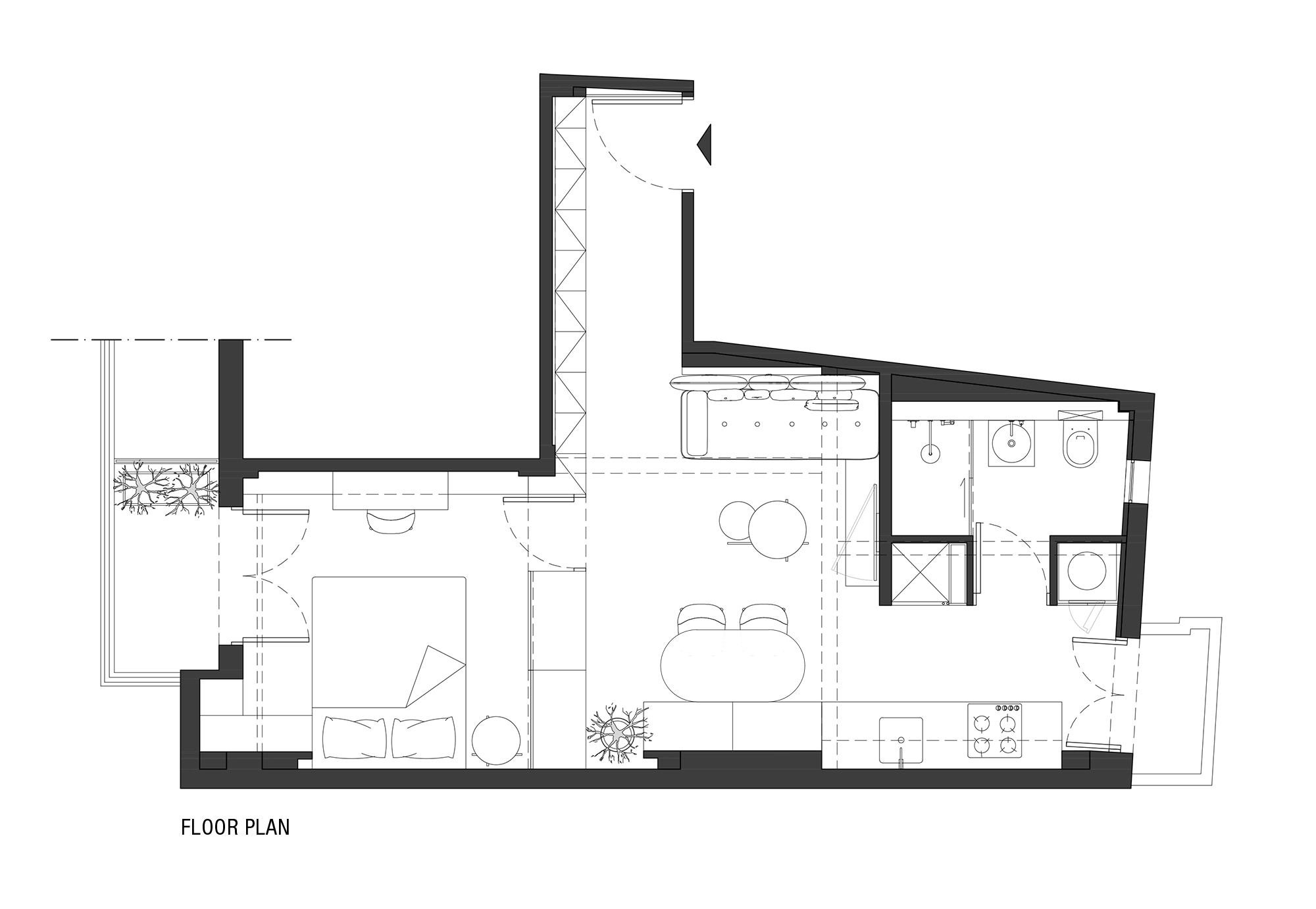 Interior walls were removed to allow daylight to penetrate from both sides, and the bedroom-living room partition was replaced with a semi-transparent closet that doubles as storage and defines circulation. The open kitchen extends into a dining bench, while recesses along walls accommodate appliances without disrupting the flow.